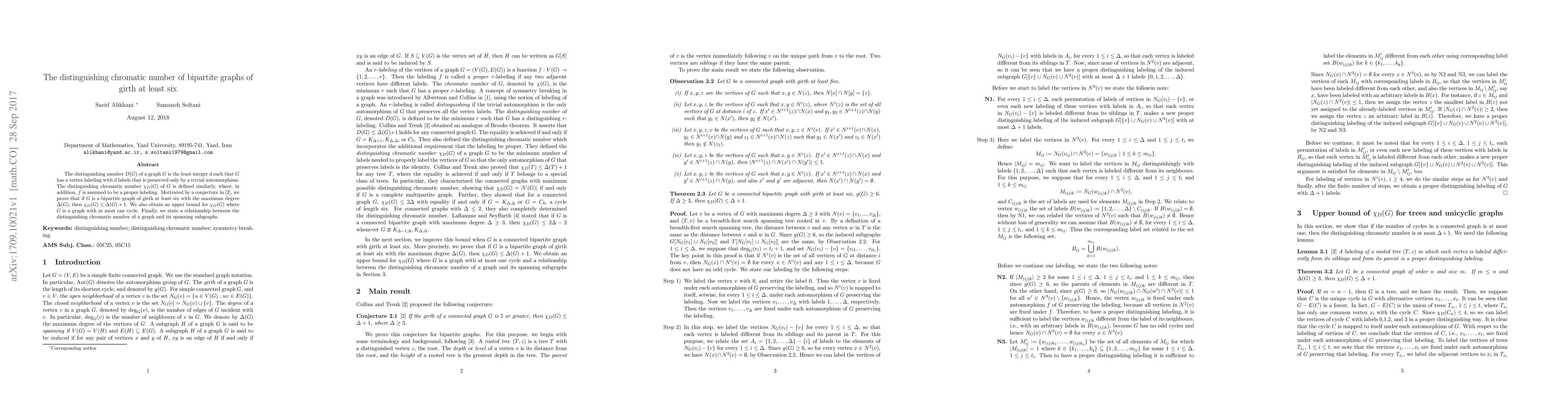 The distinguishing number $D(G)$ of a graph $G$ is the least integer $d$ such that $G$ has a vertex labeling with $d$ labels that is preserved only by a trivial automorphism. The distinguishing chromatic number $\chi_{D}(G)$ of $G$ is defined similarly, where, in addition, $f$ is assumed to be a proper labeling. Motivated by a conjecture in \cite{colins}, we prove that if $G$ is a bipartite graph of girth at least six with the maximum degree $\Delta (G)$, then $\chi_{D}(G)\leq \Delta (G)+1$. We also obtain an upper bound for $\chi_{D}(G)$ where $G$ is a graph with at most one cycle. Finally, we state a relationship between the distinguishing chromatic number of a graph and its spanning subgraphs.