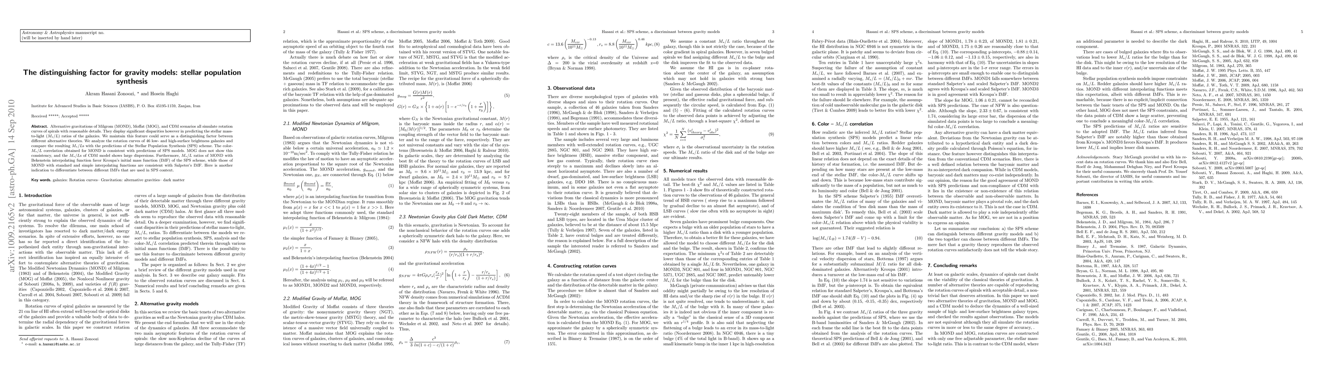 Alternative gravitations of Milgrom (MOND), Moffat (MOG), and CDM scenarios all simulate rotation curves of spirals with reasonable details. They display significant disparities however in predicting the stellar mass-to-light ($M_*/L$) ratios of the galaxies. We maintain this feature could serve as a distinguishing factor between different alternative theories. We analyze the rotation curves of 46 low- and high-surface brightness galaxies and compare the resulting $M_*/L$s with the predictions of the Stellar Population Synthesis (SPS) scheme. The color-$M_*/L$ correlation obtained for MOND is consistent with predictions of SPS models. MOG does not show this consistency, and the $M_*/L$s of CDM model shows large dispersions. Furthermore, $M_*/L$ ratios of MOND with Bekenstein interpolating function favor Kroupa's initial mass function (IMF) of the SPS scheme, while those of MOND with standard and simple interpolating functions are consistent with Salpeter's IMF. Here is another indication to differentiate between different IMFs that are used in SPS context.
