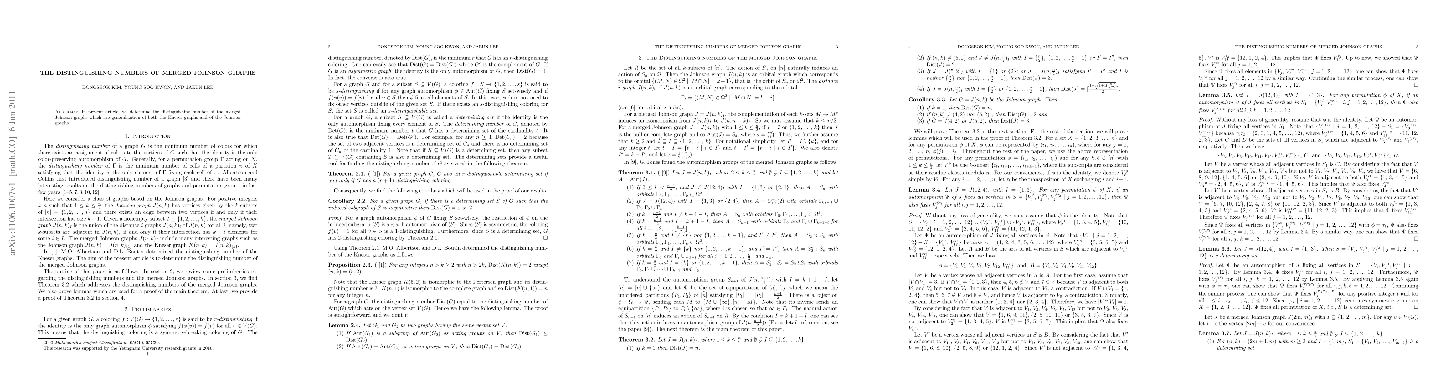 Summary: This paper determines the distinguishing number of merged Johnson graphs, which are a generalization of both Kneser graphs and Johnson graphs, providing a key measure of their structural uniqueness.