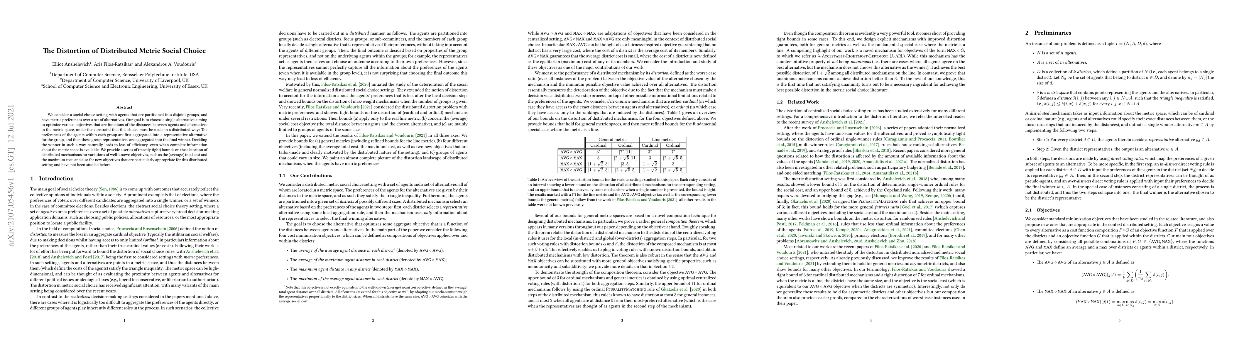 This paper explores distributed social choice mechanisms with metric preferences, analyzing the efficiency loss inherent in distributed aggregation processes. It provides bounds on the distortion for various objectives, including new metrics specific to distributed settings.