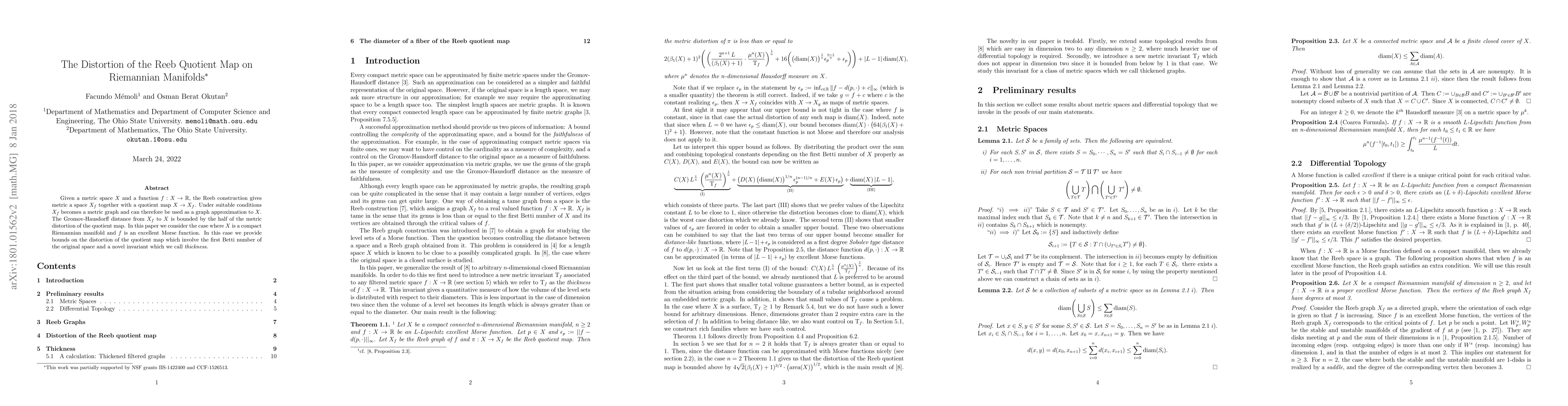 Given a metric space $X$ and a function $f: X \to \mathbb{R}$, the Reeb construction gives metric a space $X_f$ together with a quotient map $X \to X_f$. Under suitable conditions $X_f$ becomes a metric graph and can therefore be used as a graph approximation to $X$. The Gromov-Hausdorff distance from $X_f$ to $X$ is bounded by the half of the metric distortion of the quotient map. In this paper we consider the case where $X$ is a compact Riemannian manifold and $f$ is an excellent Morse function. In this case we provide bounds on the distortion of the quotient map which involve the first Betti number of the original space and a novel invariant which we call thickness.
