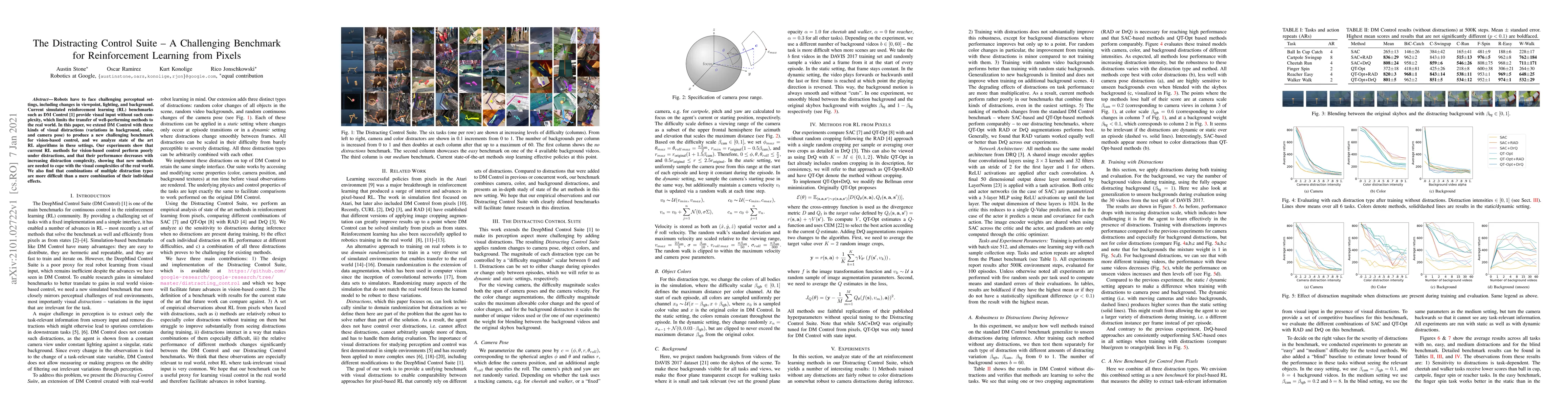 This paper introduces a new benchmark for vision-based reinforcement learning by extending the DM Control suite with visual distractions like background changes, color variations, and camera pose shifts. Experiments reveal that current RL methods struggle with these distractions, highlighting the need for new approaches to handle real-world visual complexities.