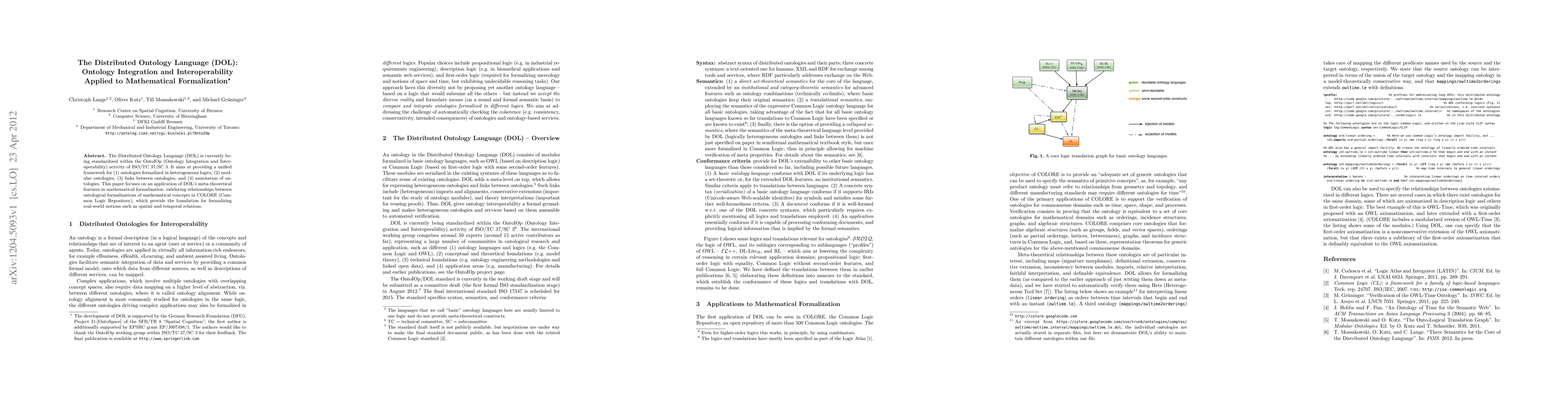 The Distributed Ontology Language (DOL) aims to standardize a framework for integrating and interoperating heterogeneous ontologies, focusing on modular structures and ontology links. The paper demonstrates DOL's application in validating mathematical formalizations within the COLORE repository, enhancing the representation of spatial and temporal relations.