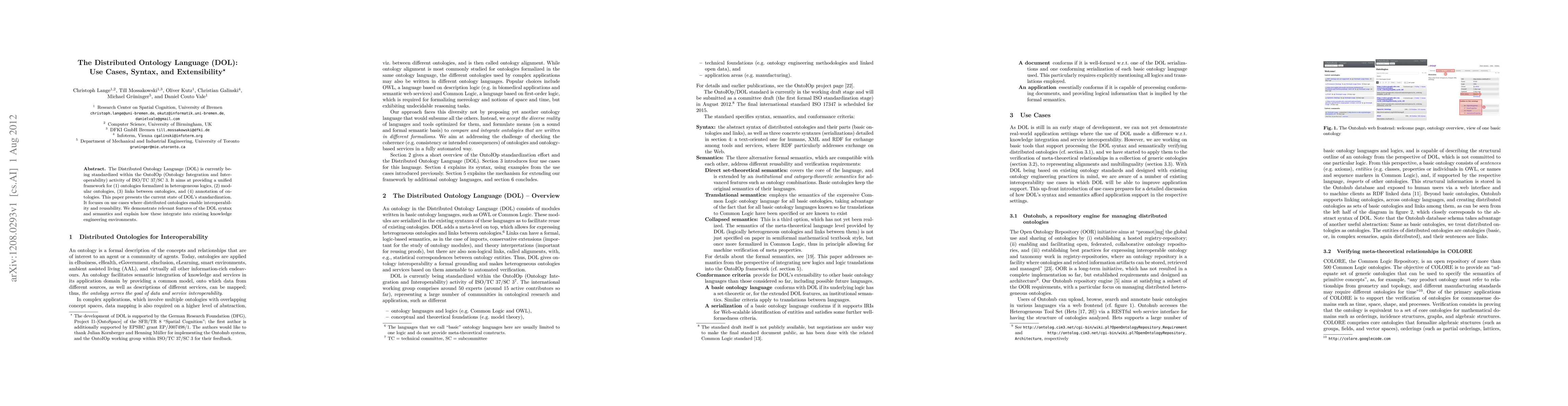 The Distributed Ontology Language (DOL) aims to standardize a unified framework for heterogeneous, modular ontologies and their interlinking, as part of the OntoIOp initiative. The paper discusses DOL's syntax, semantics, and extensibility, showcasing its use cases for enhancing interoperability and reuse in knowledge engineering.