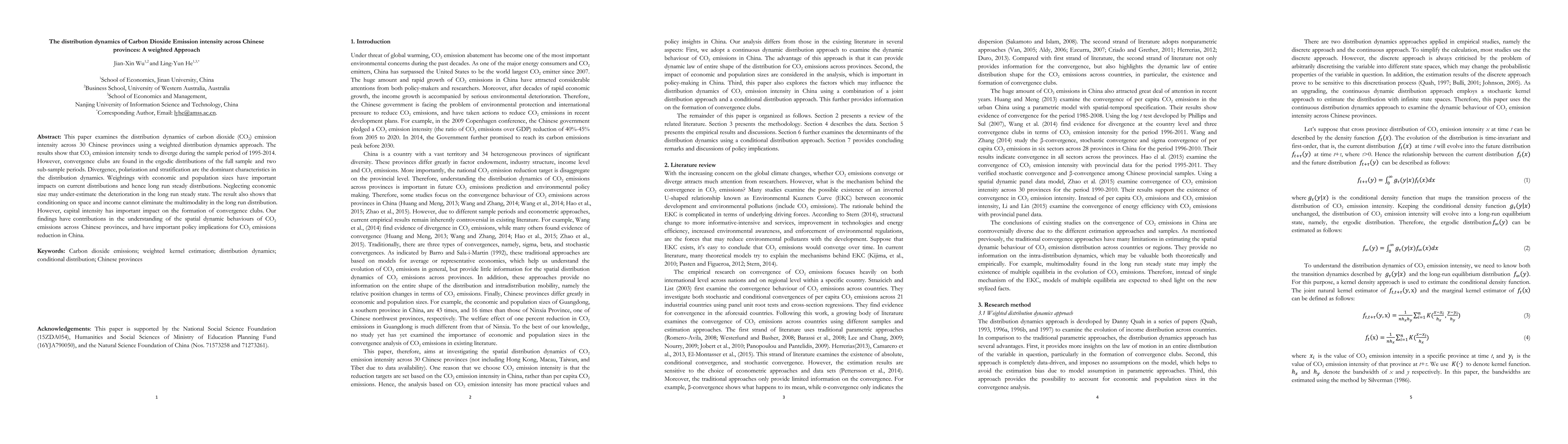This study analyzes the distribution of CO2 emission intensity across Chinese provinces from 1995-2014, revealing divergence, convergence clubs, polarization, and stratification. The research highlights the impact of economic and population weightings on current and long-term distributions, and identifies capital intensity as a key factor influencing convergence clubs, with significant policy implications for China's emission reduction efforts.