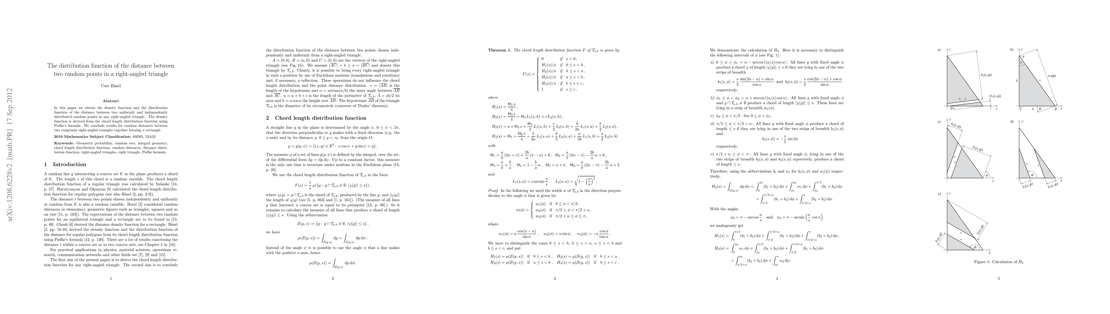 This paper derives the density and distribution functions for the distance between two random points in a right-angled triangle, employing Piefke's formula from the chord length distribution. It also extends findings to distances between points in two congruent right-angled triangles forming a rectangle.