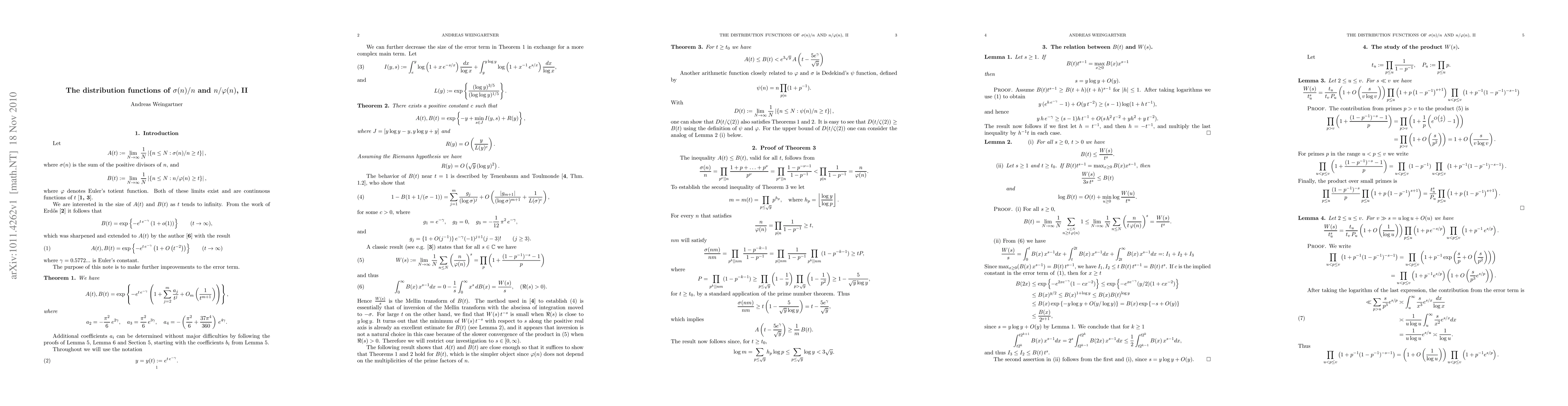 This paper improves asymptotic results for the distribution functions of χ(n)/n and n/ε(n), focusing on the natural density function A(t) as t grows unbounded, with implications for understanding divisor sums and Euler's totient function.