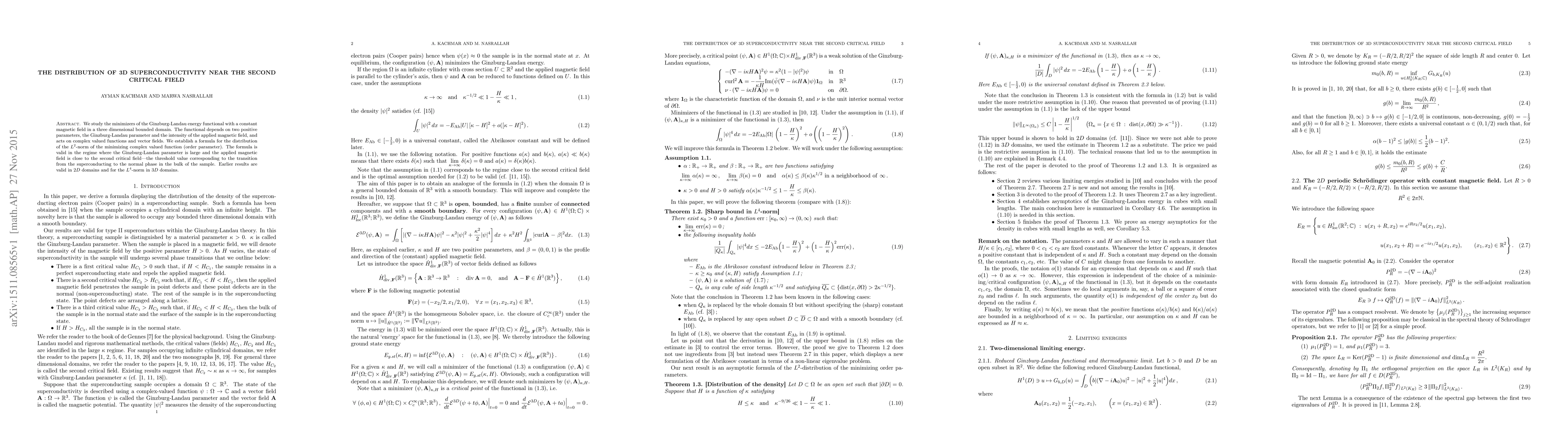 This paper investigates the distribution of 3D superconductivity near the second critical field by analyzing minimizers of the Ginzburg-Landau energy functional. It establishes a formula for the $L^2$-norm of the minimizing order parameter, valid when the Ginzburg-Landau parameter is large and the magnetic field is near the second critical field.