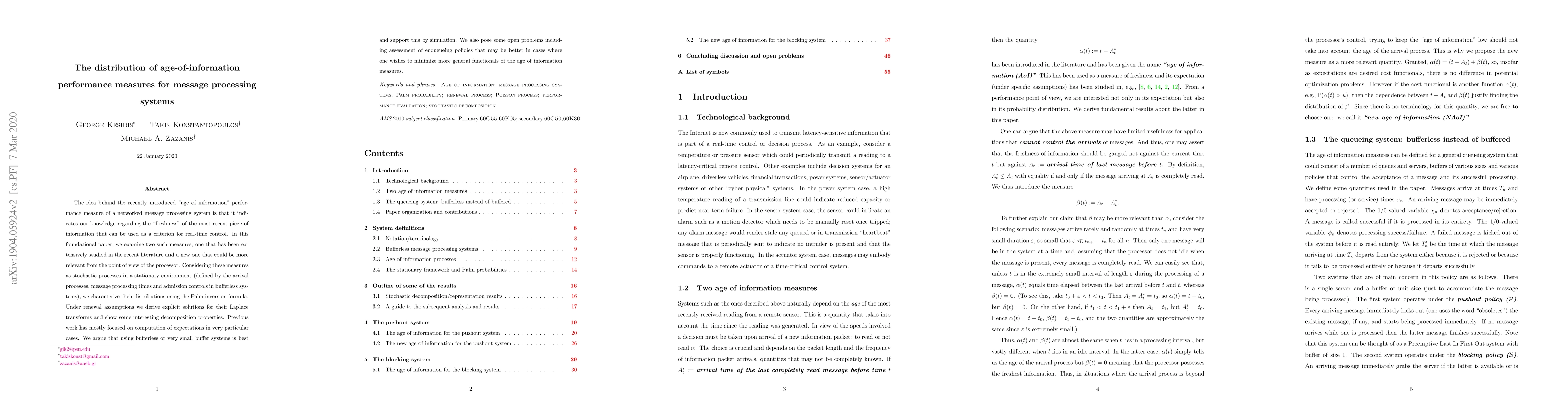 The idea behind the recently introduced "age of information" performance measure of a networked message processing system is that it indicates our knowledge regarding the "freshness" of the most recent piece of information that can be used as a criterion for real-time control. In this foundational paper, we examine two such measures, one that has been extensively studied in the recent literature and a new one that could be more relevant from the point of view of the processor. Considering these measures as stochastic processes in a stationary environment (defined by the arrival processes, message processing times and admission controls in bufferless systems), we characterize their distributions using the Palm inversion formula. Under renewal assumptions we derive explicit solutions for their Laplace transforms and show some interesting decomposition properties. Previous work has mostly focused on computation of expectations in very particular cases. We argue that using bufferless or very small buffer systems is best and support this by simulation. We also pose some open problems including assessment of enqueueing policies that may be better in cases where one wishes to minimize more general functionals of the age of information measures.
