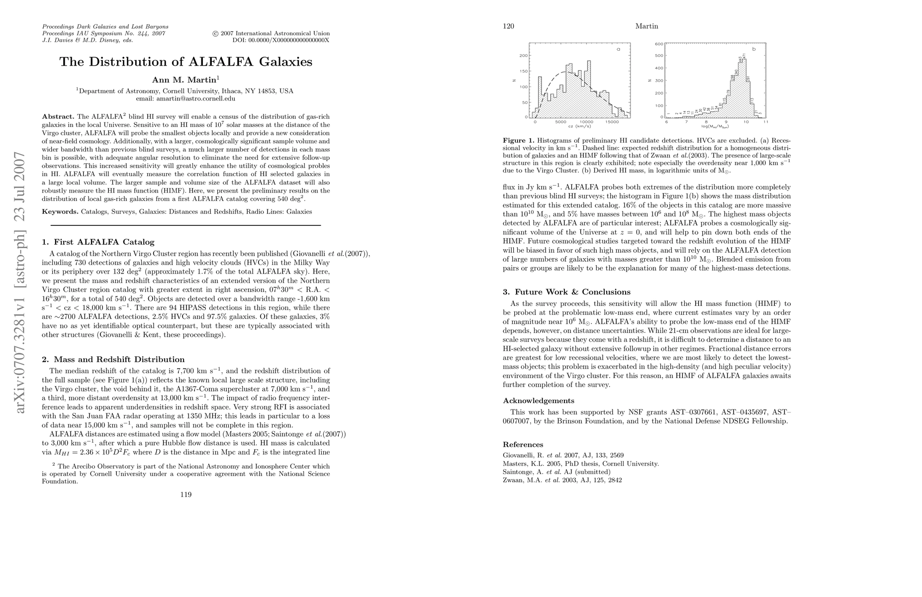 The ALFALFA blind HI survey will enable a census of the distribution of gas-rich galaxies in the local Universe. Sensitive to an HI mass of 10**7 solar masses at the distance of the Virgo cluster, ALFALFA will probe the smallest objects locally and provide a new consideration of near-field cosmology. Additionally, with a larger, cosmologically significant sample volume and wider bandwidth than previous blind surveys, a much larger number of detections in each mass bin is possible, with adequate angular resolution to eliminate the need for extensive follow-up observations. This increased sensitivity will greatly enhance the utility of cosmological probles in HI. ALFALFA will eventually measure the correlation function of HI selected galaxies in a large local volume. The larger sample and volume size of the ALFALFA dataset will also robustly measure the HI mass function (HIMF). Here, we present the preliminary results on the distribution of local gas-rich galaxies from a first ALFALFA catalog covering 540 deg**2.