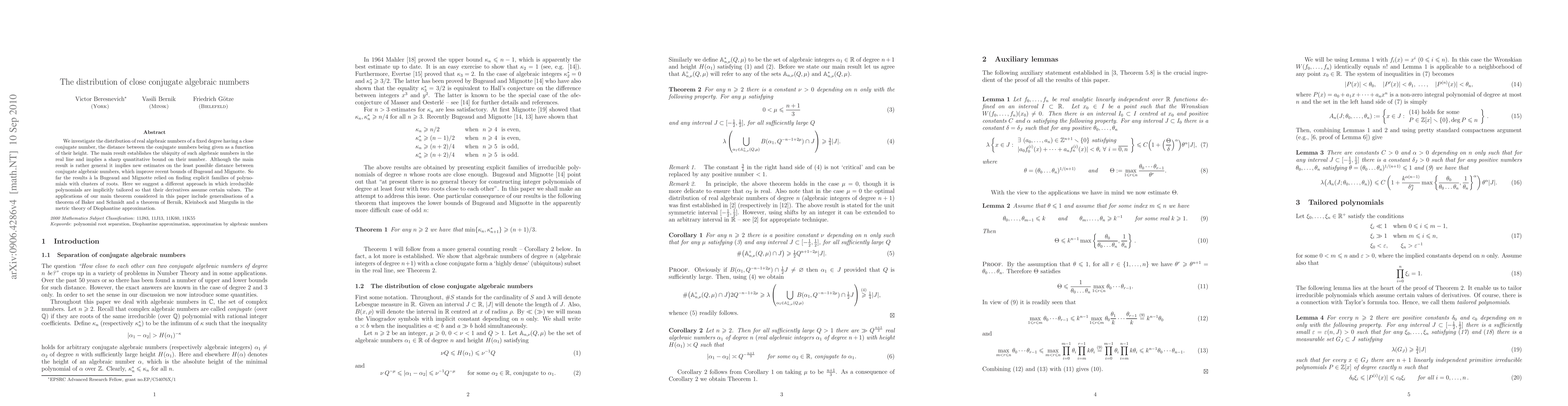 We investigate the distribution of real algebraic numbers of a fixed degree having a close conjugate number, the distance between the conjugate numbers being given as a function of their height. The main result establishes the ubiquity of such algebraic numbers in the real line and implies a sharp quantitative bound on their number. Although the main result is rather general it implies new estimates on the least possible distance between conjugate algebraic numbers, which improve recent bounds of Bugeaud and Mignotte. So far the results a la Bugeaud and Mignotte relied on finding explicit families of polynomials with clusters of roots. Here we suggest a different approach in which irreducible polynomials are implicitly tailored so that their derivatives assume certain values. The applications of our main theorem considered in this paper include generalisations of a theorem of Baker and Schmidt and a theorem of Bernik, Kleinbock and Margulis in the metric theory of Diophantine approximation.