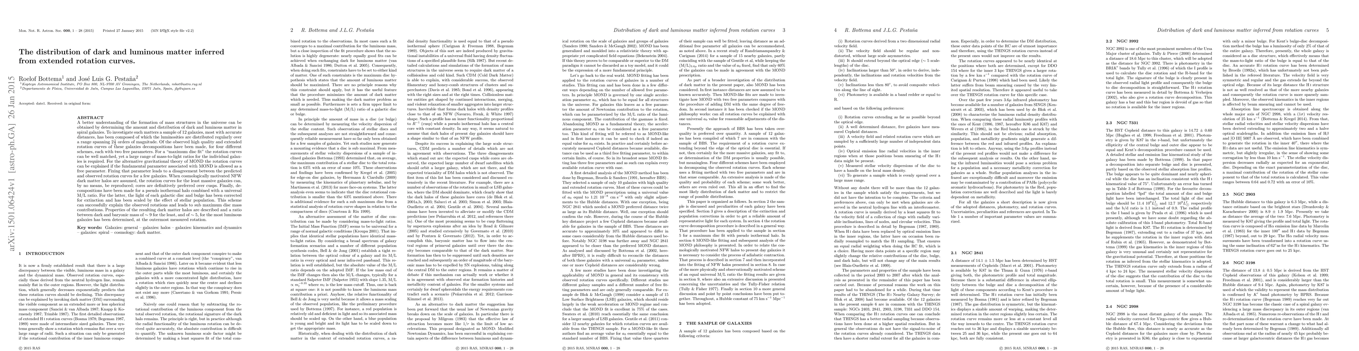 This paper investigates the distribution of dark and luminous matter in spiral galaxies using extended rotation curves. It concludes that pseudo isothermal halos with a universal mass-to-light ratio provide the best fit to observed rotation curves, suggesting a dark-to-baryonic mass ratio of about 9:1 for the least luminous galaxies and 5:1 for the most luminous ones.