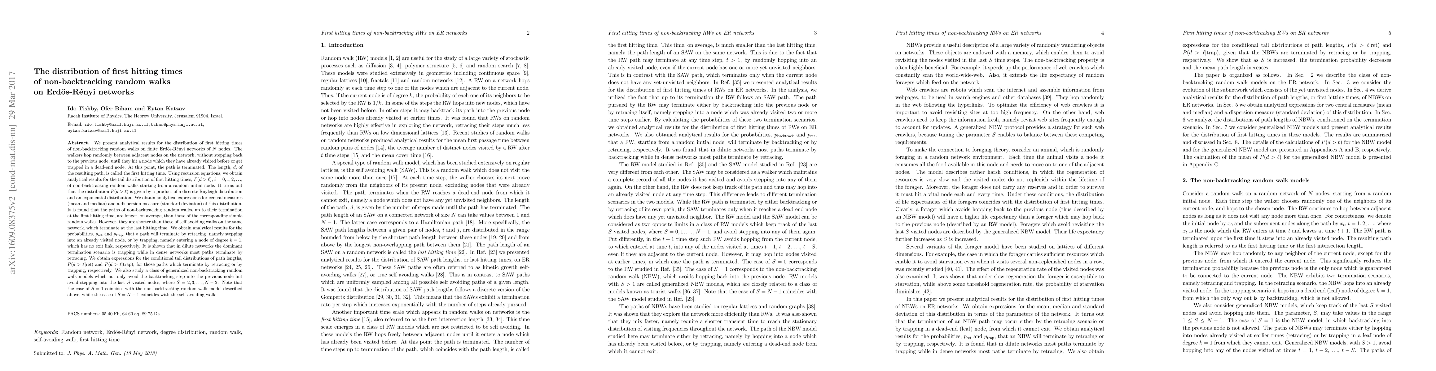 This paper analyzes the distribution of first hitting times for non-backtracking random walks on Erdős-Rényi networks, showing that the tail distribution follows a product of a discrete Rayleigh and an exponential distribution. The study reveals that these paths are longer than simple random walks but shorter than self-avoiding walks, and provides a detailed analysis of termination scenarios and conditional distributions.