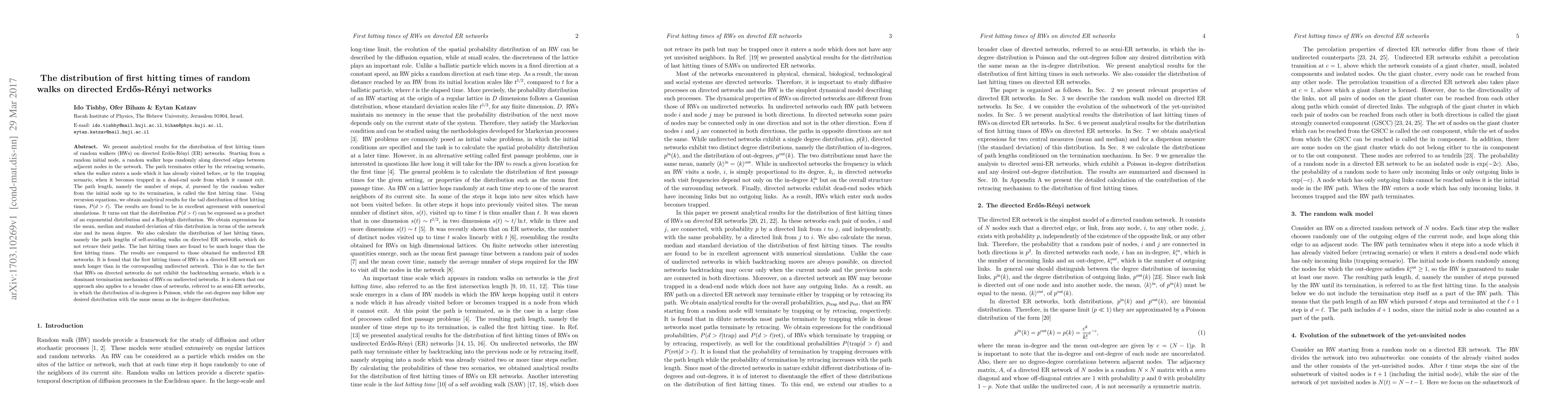 This paper analytically investigates the distribution of first hitting times for random walkers on directed Erdős-Rényi networks, revealing that these times are longer than in undirected counterparts due to the absence of backtracking. The study also derives expressions for the mean, median, and standard deviation of these hitting times and compares them to self-avoiding walks on the same networks.