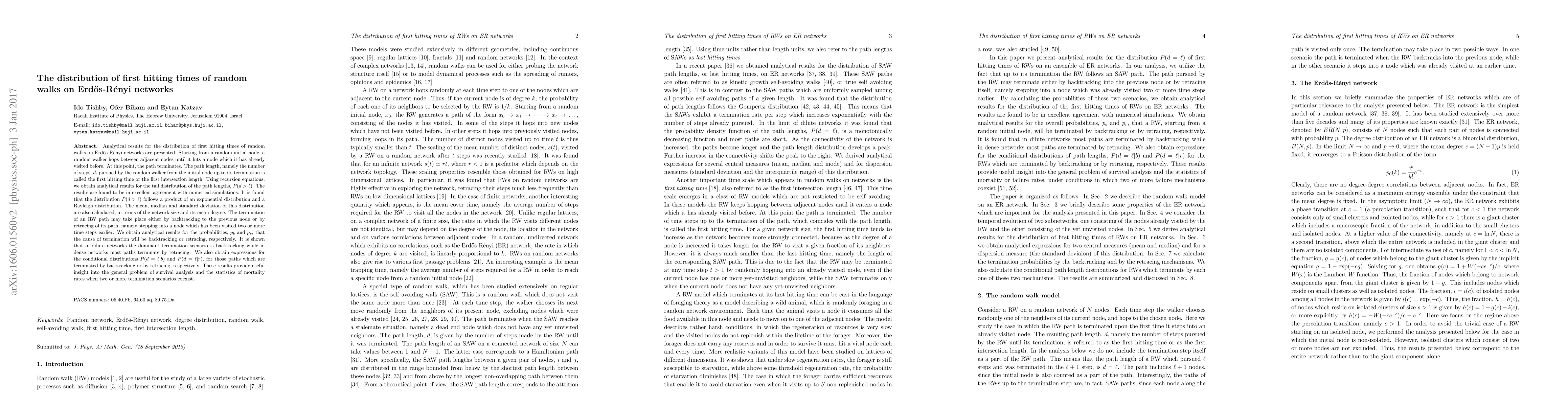 This paper presents analytical results for the distribution of first hitting times in random walks on Erdős-Rényi networks, showing that the tail distribution follows a product of an exponential and a Rayleigh distribution. It also analyzes the probabilities of termination by backtracking or retracing, revealing that backtracking dominates in dilute networks while retracing is more common in dense networks.