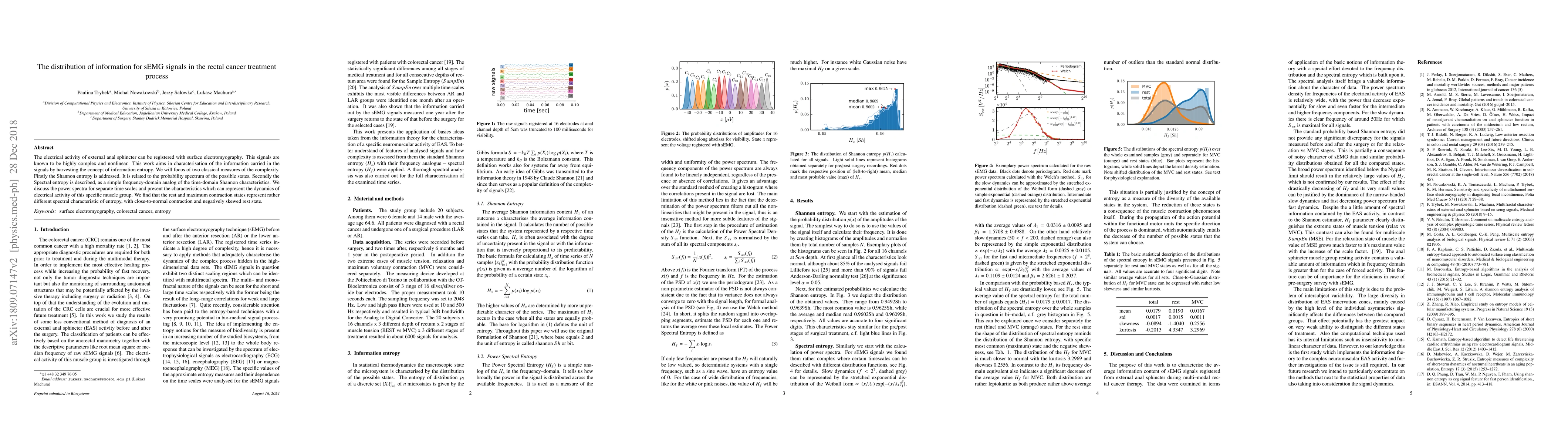 The electrical activity of external anal sphincter can be registered with surface electromyography. This signals are known to be highly complex and nonlinear. This work aims in characterisation of the information carried in the signals by harvesting the concept of information entropy. We will focus of two classical measures of the complexity. Firstly the Shannon entropy is addressed. It is related to the probability spectrum of the possible states. Secondly the Spectral entropy is described, as a simple frequency-domain analog of the time-domain Shannon characteristics. We discuss the power spectra for separate time scales and present the characteristics which can represent the dynamics of electrical activity of this specific muscle group. We find that the rest and maximum contraction states represent rather different spectral characteristic of entropy, with close-to-normal contraction and negatively skewed rest state.