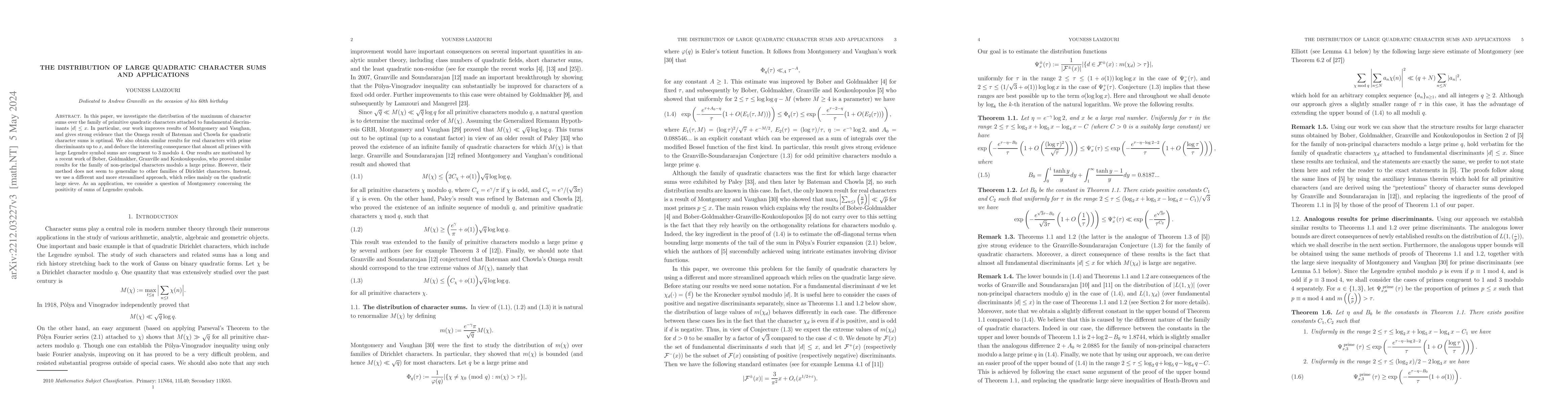 This paper improves on Montgomery and Vaughan's results regarding the distribution of large quadratic character sums, providing evidence that the Omega result of Bateman and Chowla is optimal. It also deduces that almost all primes with large Legendre symbol sums are congruent to 3 modulo 4, using a streamlined approach based on the quadratic large sieve.