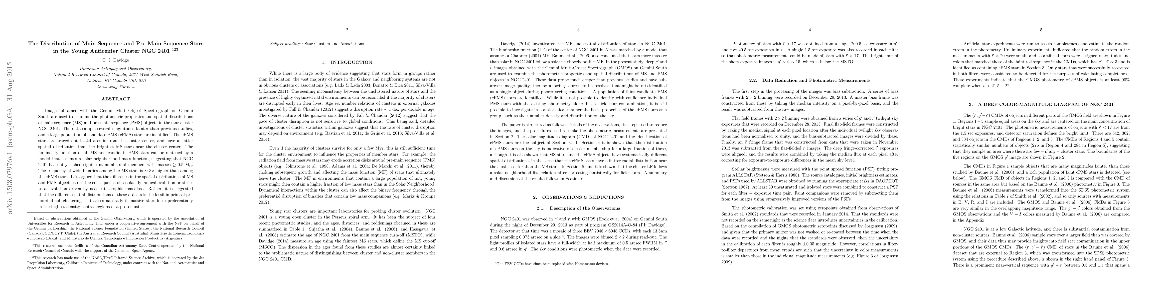 Images obtained with the Gemini Multi-Object Spectrograph on Gemini South are used to examine the photometric properties and spatial distributions of main sequence (MS) and pre-main sequence (PMS) objects in the star cluster NGC 2401. The data sample several magnitudes fainter than previous studies, and a large population of candidate PMS (cPMS) stars are identified. The cPMS stars are traced out to 2.4 arcmin from the cluster center, and have a flatter spatial distribution than the brightest MS stars near the cluster center. The luminosity function of all MS and candidate PMS stars can be matched by a model that assumes a solar neighborhood mass function, suggesting that NGC 2401 has not yet shed significant numbers of members with masses in excess of 0.5 solar. The frequency of wide binaries among the MS stars is ~3 times higher than among the cPMS stars. It is argued that the difference in the spatial distributions of MS and PMS objects is not the consequence of secular dynamical evolution or structural evolution driven by near-catastrophic mass loss. Rather, it is suggested that the different spatial distributions of these objects is the fossil imprint of primordial sub-clustering that arises naturally if massive stars form preferentially in the highest density central regions of a protocluster.
