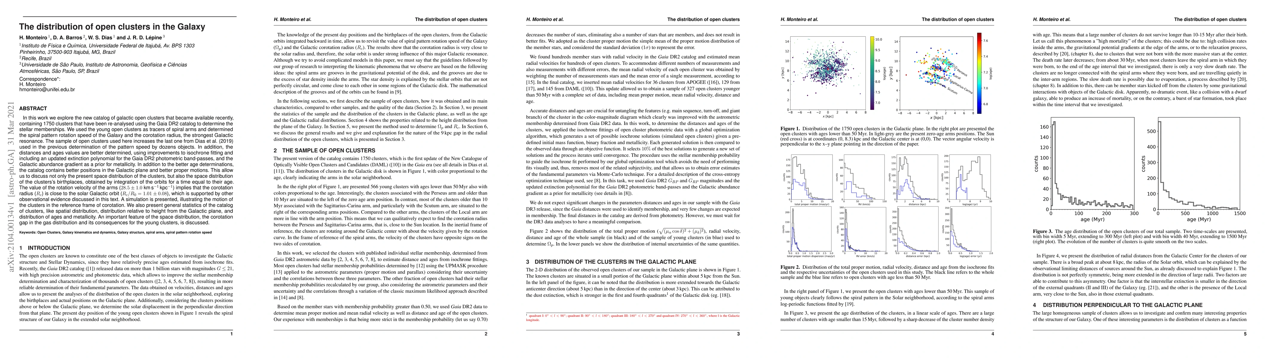In this work we explore the new catalog of galactic open clusters that became available recently, containing 1750 clusters that have been re-analysed using the Gaia DR2 catalog to determine the stellar memberships. We used the young open clusters as tracers of spiral arms and determined the spiral pattern rotation speed of the Galaxy and the corotation radius, the strongest Galactic resonance. The sample of open clusters used here increases the last one from Dias et al. (2019) used in the previous determination of the pattern speed by dozens objects. In addition, the distances and ages values are better determined, using improvements to isochrone fitting and including an updated extinction polynomial for the Gaia DR2 photometric band-passes, and the Galactic abundance gradient as a prior for metallicity. In addition to the better age determinations, the catalog contains better positions in the Galactic plane and better proper motions. This allow us to discuss not only the present space distribution of the clusters, but also the space distribution of the clusters's birthplaces, obtained by integration of the orbits for a time equal to their age. The value of the rotation velocity of the arms ($28.5 \pm 1.0$ km s$^{-1}$ kpc$^{-1}$) implies that the corotation radius ($R_c$) is close to the solar Galactic orbit ($R_c/R_0 = 1.01\pm0.08$), which is supported by other observational evidence discussed in this text. A simulation is presented, illustrating the motion of the clusters in the reference frame of corotation. We also present general statistics of the catalog of clusters, like spatial distribution, distribution relative to height from the Galactic plane, and distribution of ages and metallicity. An important feature of the space distribution, the corotation gap in the gas distribution and its consequences for the young clusters, is discussed.