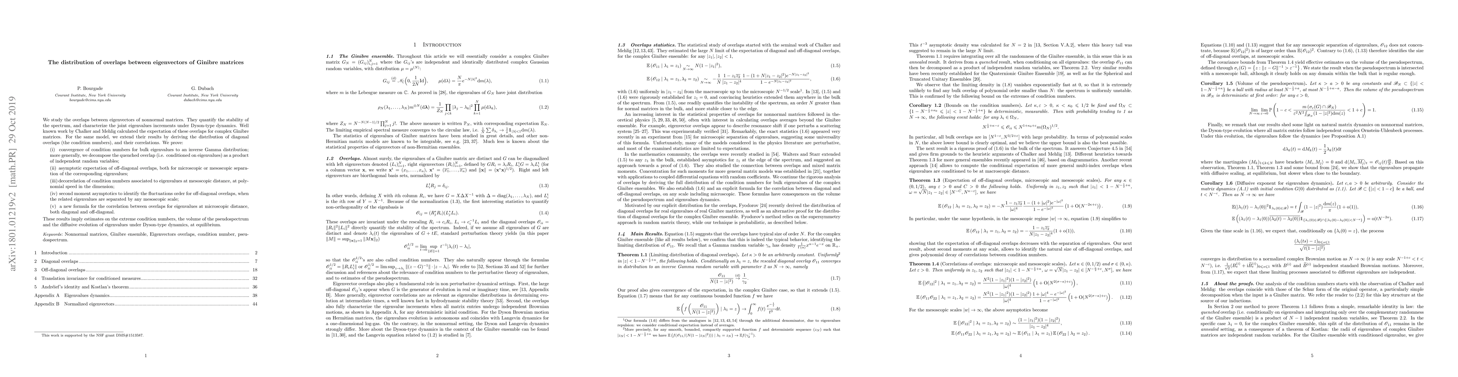 This paper extends the study of overlaps between eigenvectors of complex Ginibre matrices, focusing on the distribution of diagonal overlaps (condition numbers) and their correlations. It proves convergence of condition numbers to an inverse Gamma distribution and provides asymptotic expectations and decorrelation results for both diagonal and off-diagonal overlaps, offering insights into the stability of the spectrum and the dynamics of eigenvalues under Dyson-type processes.