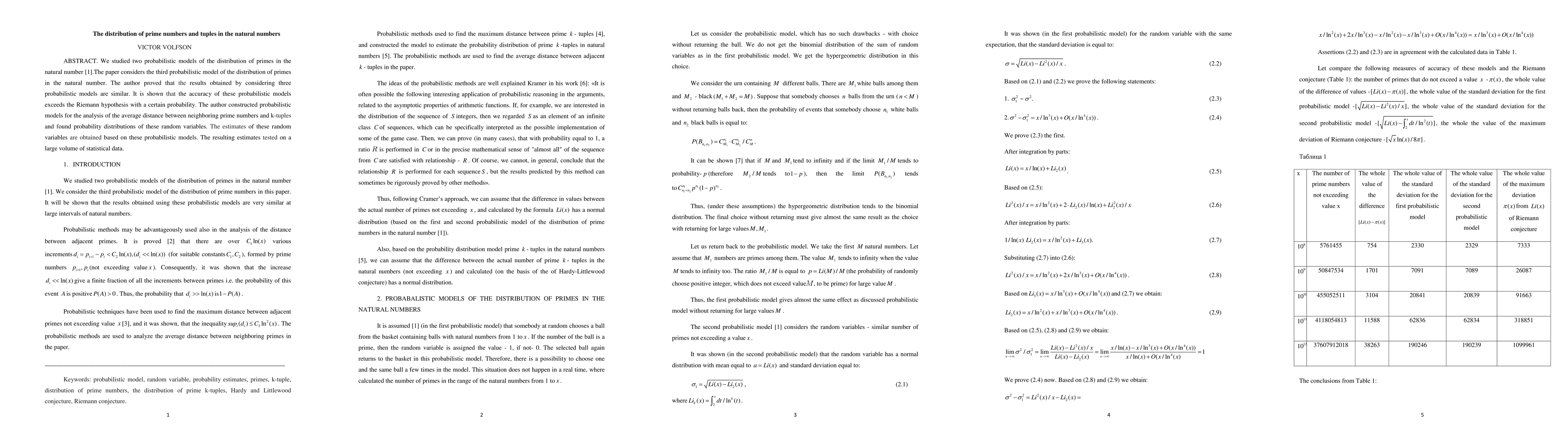 This paper introduces a third probabilistic model to study the distribution of prime numbers and k-tuples in natural numbers, demonstrating its similarity to previous models and surpassing the accuracy of the Riemann hypothesis. It also constructs probabilistic models to estimate the average distance between neighboring primes and k-tuples, with results validated through extensive statistical testing.