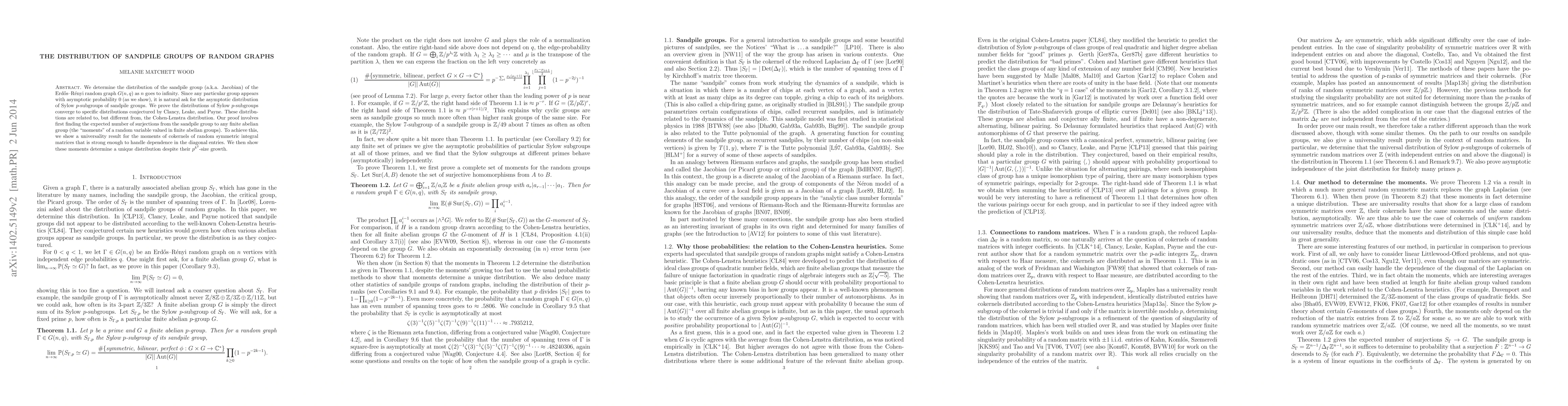 This paper investigates the asymptotic distribution of sandpile groups in Erdős-Rényi random graphs, proving that the distribution of Sylow p-subgroups converges to specific conjectured distributions different from the Cohen-Lenstra distribution. The proof leverages moments of cokernels of random symmetric integral matrices and a universality result for these moments.