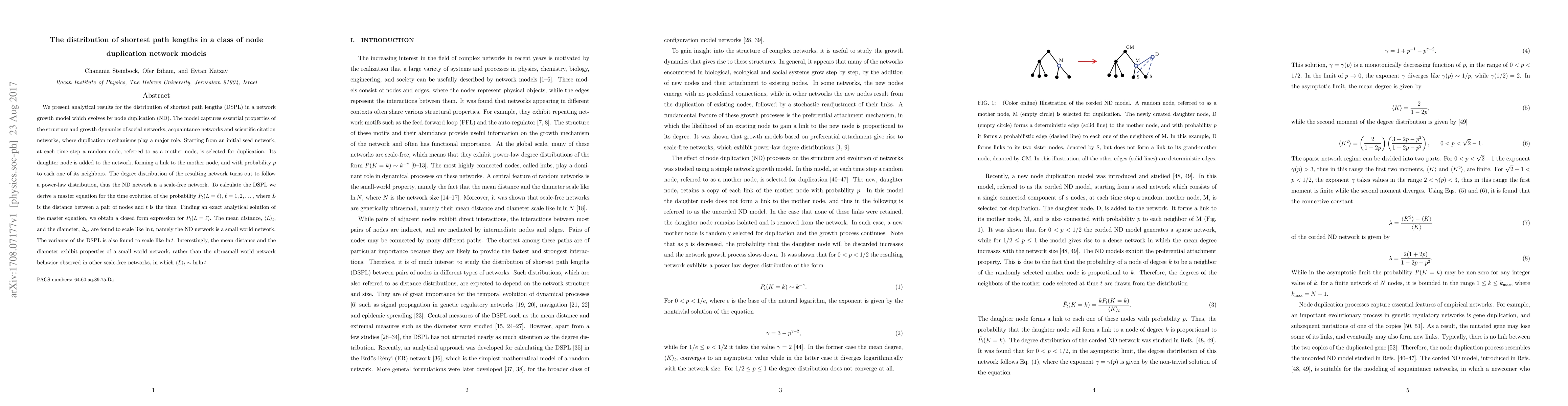 We present analytical results for the distribution of shortest path lengths (DSPL) in a network growth model which evolves by node duplication (ND). The model captures essential properties of the structure and growth dynamics of social networks, acquaintance networks and scientific citation networks, where duplication mechanisms play a major role. Starting from an initial seed network, at each time step a random node, referred to as a mother node, is selected for duplication. Its daughter node is added to the network, forming a link to the mother node, and with probability $p$ to each one of its neighbors. The degree distribution of the resulting network turns out to follow a power-law distribution, thus the ND network is a scale-free network. To calculate the DSPL we derive a master equation for the time evolution of the probability $P_t(L=\ell)$, $\ell=1,2,\dots$, where $L$ is the distance between a pair of nodes and $t$ is the time. Finding an exact analytical solution of the master equation, we obtain a closed form expression for $P_t(L=\ell)$. The mean distance, $\langle L \rangle_t$, and the diameter, $\Delta_t$, are found to scale like $\ln t$, namely the ND network is a small world network. The variance of the DSPL is also found to scale like $\ln t$. Interestingly, the mean distance and the diameter exhibit properties of a small world network, rather than the ultrasmall world network behavior observed in other scale-free networks, in which $\langle L \rangle_t \sim \ln \ln t$.