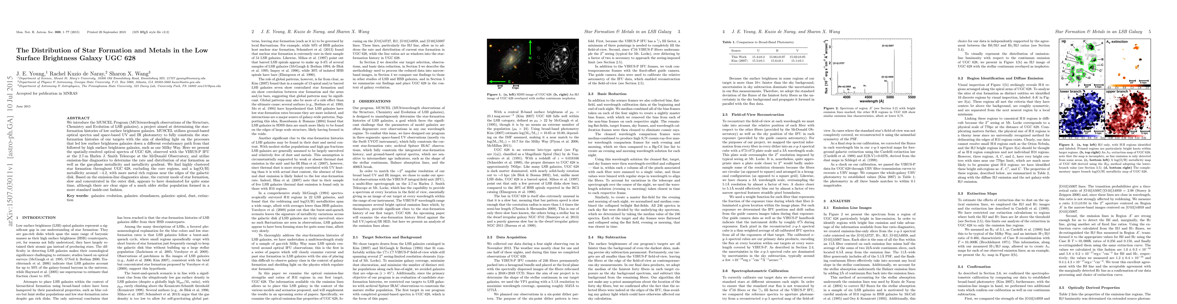 We introduce the MUSCEL Program (MUltiwavelength observations of the Structure, Chemistry and Evolution of LSB galaxies), a project aimed at determining the star-formation histories of low surface brightness galaxies. MUSCEL utilizes ground-based optical spectra and space-based UV and IR photometry to fully constrain the star-formation histories of our targets with the aim of shedding light on the processes that led low surface brightness galaxies down a different evolutionary path from that followed by high surface brightness galaxies, such as our Milky Way. Here we present the spatially-resolved optical spectra of UGC 628, observed with the VIRUS-P IFU at the 2.7-m Harlen J. Smith Telescope at the McDonald Observatory, and utilize emission-line diagnostics to determine the rate and distribution of star formation as well as the gas-phase metallicity and metallicity gradient. We find highly clustered star formation throughout UGC 628, excluding the core regions, and a log(O/H) metallicity around -4.2, with more metal rich regions near the edges of the galactic disk. Based on the emission-line diagnostics alone, the current mode of star formation, slow and concentrated in the outer disk, appears to have dominated for quite some time, although there are clear signs of a much older stellar population formed in a more standard inside-out fashion.