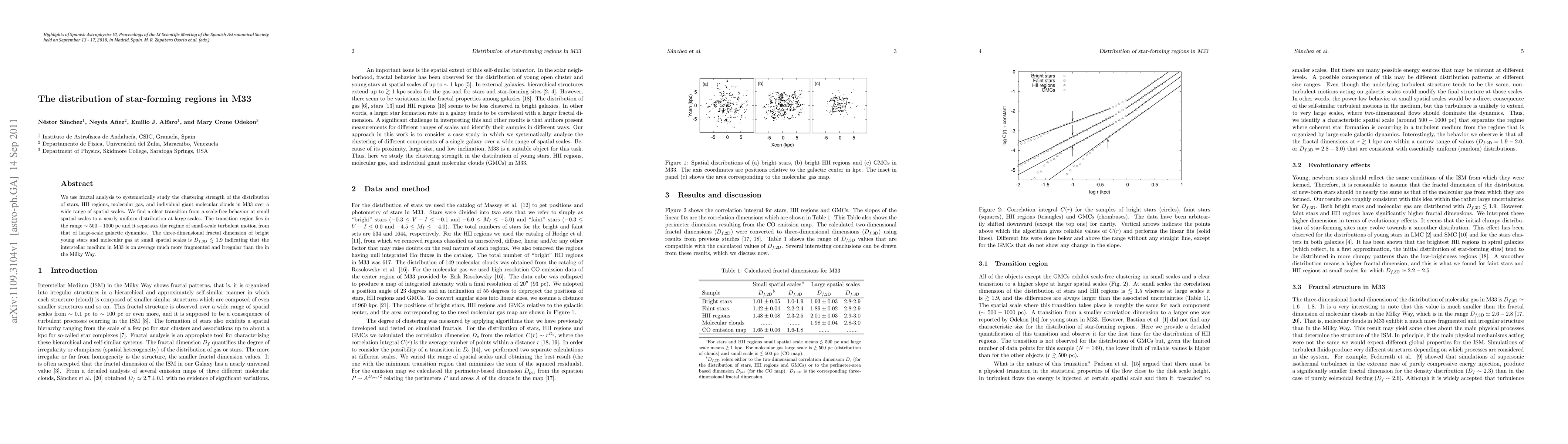 Researchers studied star-forming regions in M33 galaxy using fractal analysis, finding a transition from scale-free behavior to uniform distribution at large scales, with the interstellar medium being more fragmented than in the Milky Way.