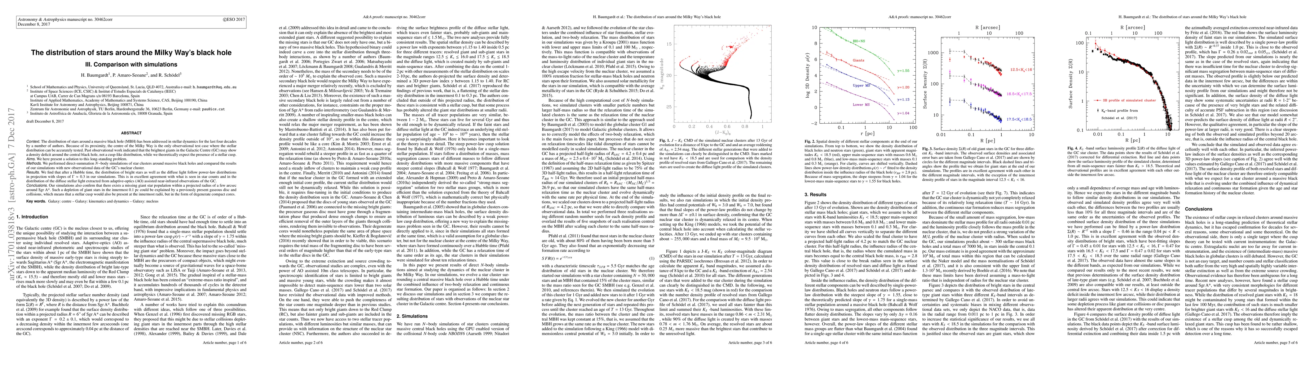 This paper resolves the discrepancy between observational data and theoretical expectations regarding the stellar distribution around the Milky Way's central black hole. Through $N-$body simulations, the authors find that after a Hubble time, the star distribution matches observational data, indicating a power-law distribution and a missing giant star population near the black hole, likely due to past gaseous disc interactions and collisions.
