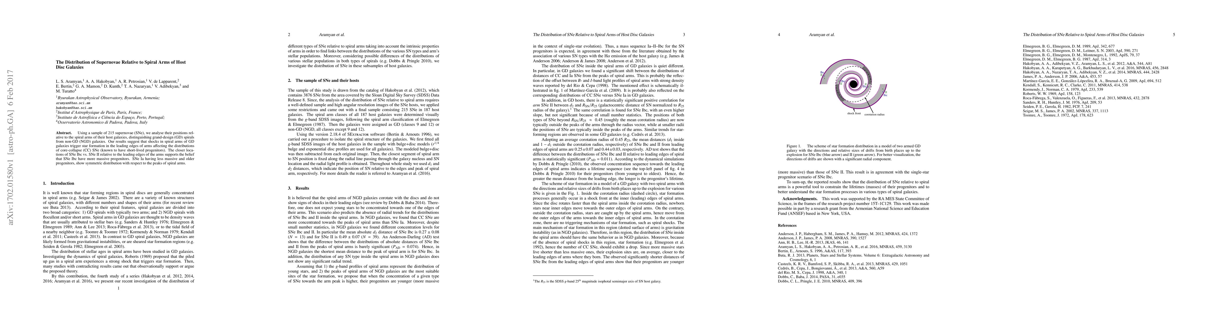 This study analyzes the distribution of 215 supernovae relative to the spiral arms of their host galaxies, finding that core-collapse supernovae in grand-design spiral galaxies tend to form in the leading edges of arms due to shock-induced star formation. Supernovae Ibc are closer to these leading edges, indicating more massive progenitors, while SNe Ia show a symmetric distribution due to less massive, older progenitors.