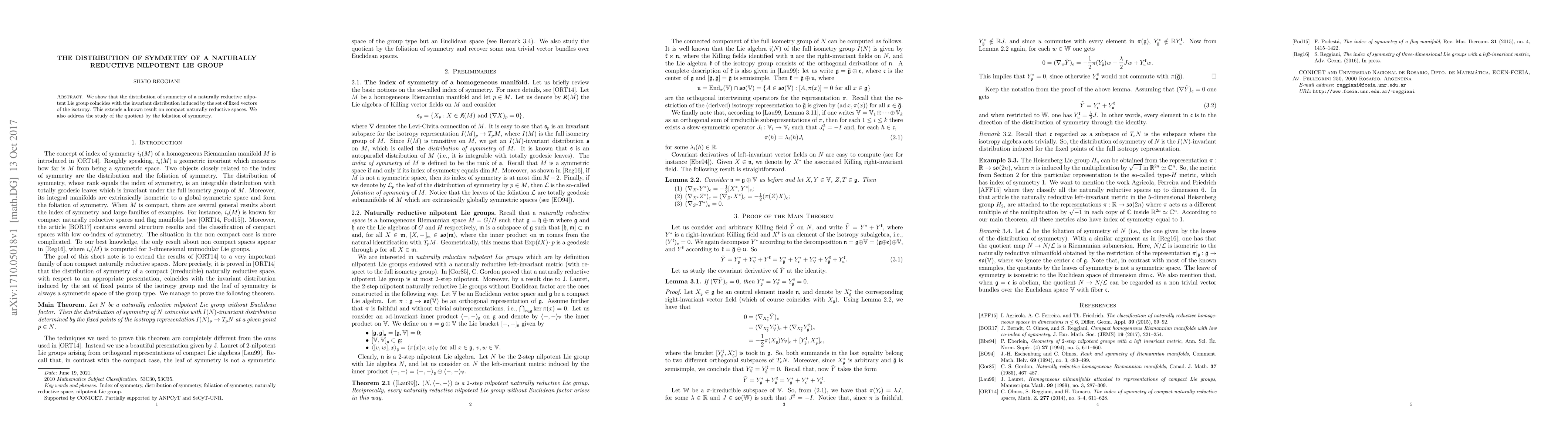 A study on naturally reductive nilpotent Lie groups finds that symmetry distribution coincides with invariant distributions induced by fixed vectors of isotropy, extending a known result to compact spaces.