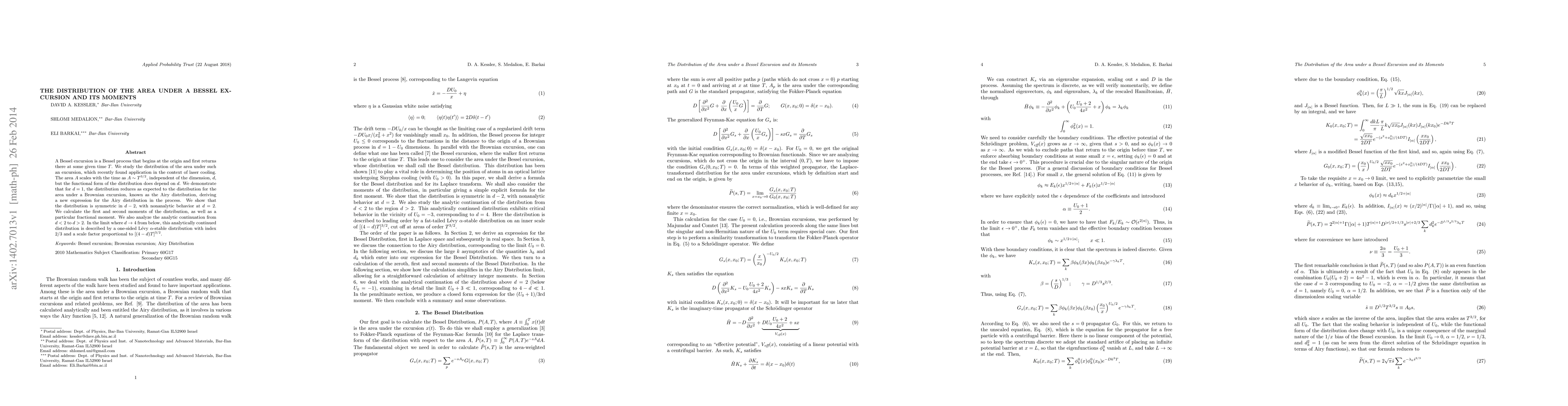 This paper studies the area under a Bessel excursion, focusing on its distribution and moments. The area scales as $A \sim T^{3/2}$, and the distribution varies with dimension $d$, showing symmetry and nonanalytic behavior at $d=2$. The first and second moments are calculated, and the analytic continuation from $d<2$ to $d>2$ reveals a one-sided Lévy $\alpha$-stable distribution for $d\to 4$ from below.