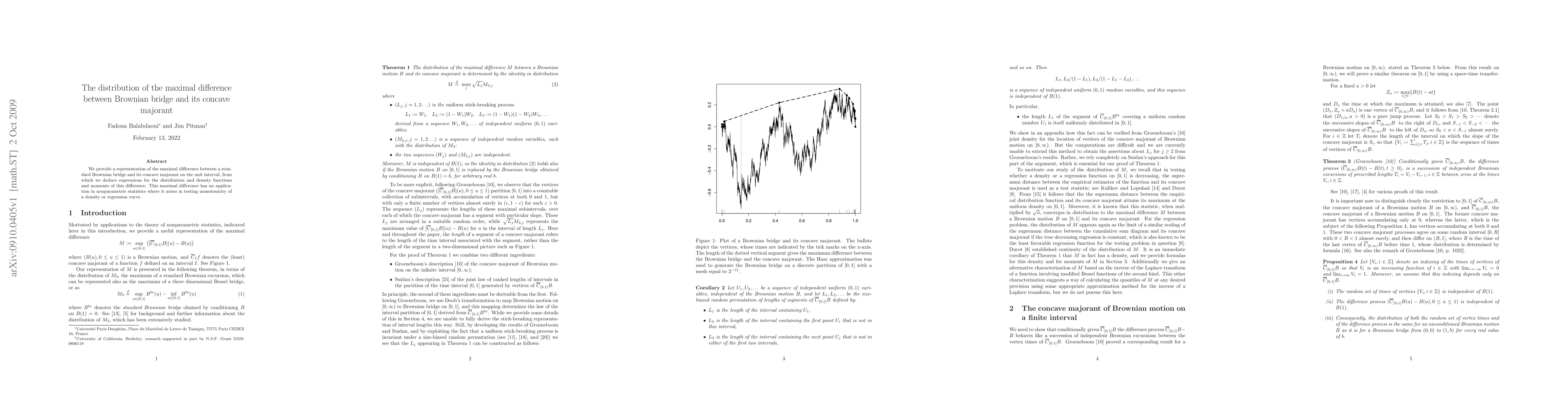 Summary: This paper presents a representation for the maximal difference between a Brownian bridge and its concave majorant, deriving expressions for its distribution, density functions, and moments, with applications in nonparametric tests for monotonicity in density or regression curves.