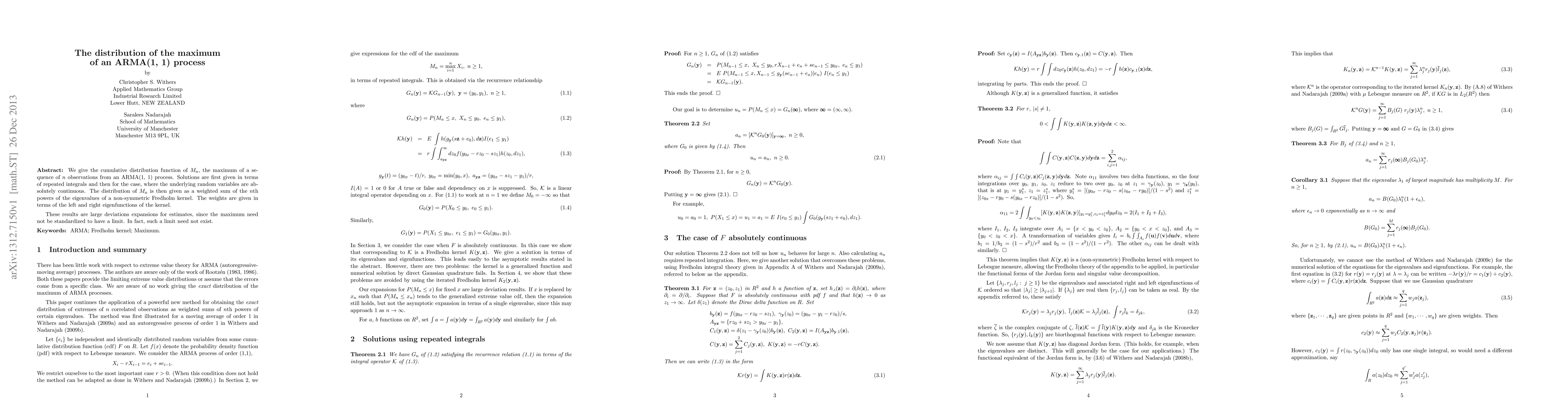 We give the cumulative distribution function of $M_n$, the maximum of a sequence of $n$ observations from an ARMA(1, 1) process. Solutions are first given in terms of repeated integrals and then for the case, where the underlying random variables are absolutely continuous. The distribution of $M_n$ is then given as a weighted sum of the $n$th powers of the eigenvalues of a non-symmetric Fredholm kernel. The weights are given in terms of the left and right eigenfunctions of the kernel. These results are large deviations expansions for estimates, since the maximum need not be standardized to have a limit. In fact, such a limit need not exist.