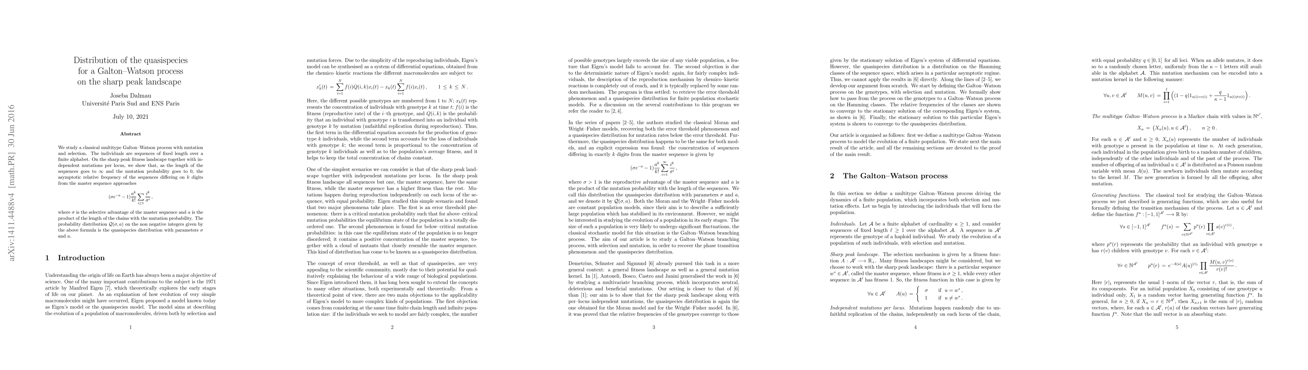 This paper investigates the quasispecies distribution for a multitype Galton-Watson process on a sharp peak fitness landscape, demonstrating that as sequence length increases and mutation probability decreases, the distribution of sequences differing from a master sequence converges to a specific formula involving the selective advantage and mutation rate.