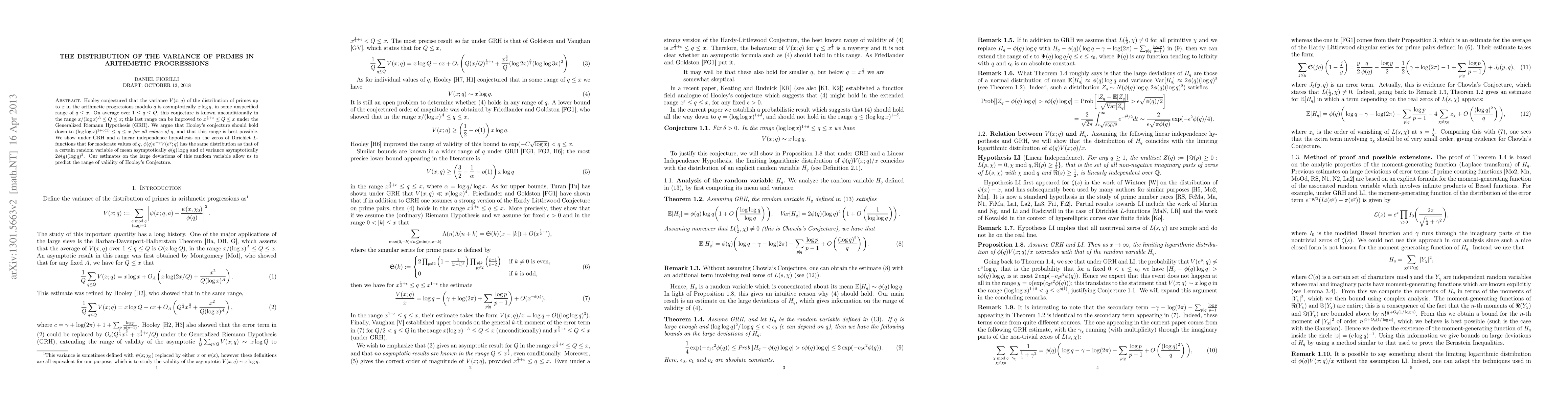 Hooley conjectured that the variance V(x;q) of the distribution of primes up to x in the arithmetic progressions modulo q is asymptotically x log q, in some unspecified range of q\leq x. On average over 1\leq q \leq Q, this conjecture is known unconditionally in the range x/(log x)^A \leq Q \leq x; this last range can be improved to x^{\frac 12+\epsilon} \leq Q \leq x under the Generalized Riemann Hypothesis (GRH). We argue that Hooley's conjecture should hold down to (loglog x)^{1+o(1)} \leq q \leq x for all values of q, and that this range is best possible. We show under GRH and a linear independence hypothesis on the zeros of Dirichlet L-functions that for moderate values of q, \phi(q)e^{-y}V(e^y;q) has the same distribution as that of a certain random variable of mean asymptotically \phi(q) log q and of variance asymptotically 2\phi(q)(log q)^2. Our estimates on the large deviations of this random variable allow us to predict the range of validity of Hooley's Conjecture.