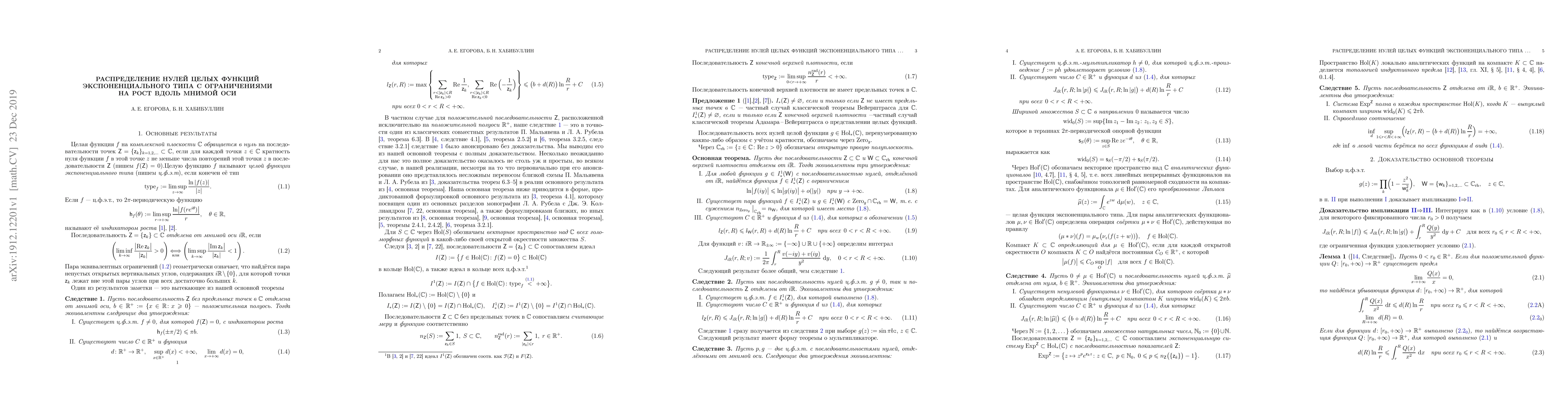 The paper provides a criterion for the existence of an entire function that vanishes on a given sequence of points while satisfying a constraint related to exponential type and growth along the imaginary axis. The results have applications in multipliers, analytic functionals, convolution theory, and the completeness of exponential systems.