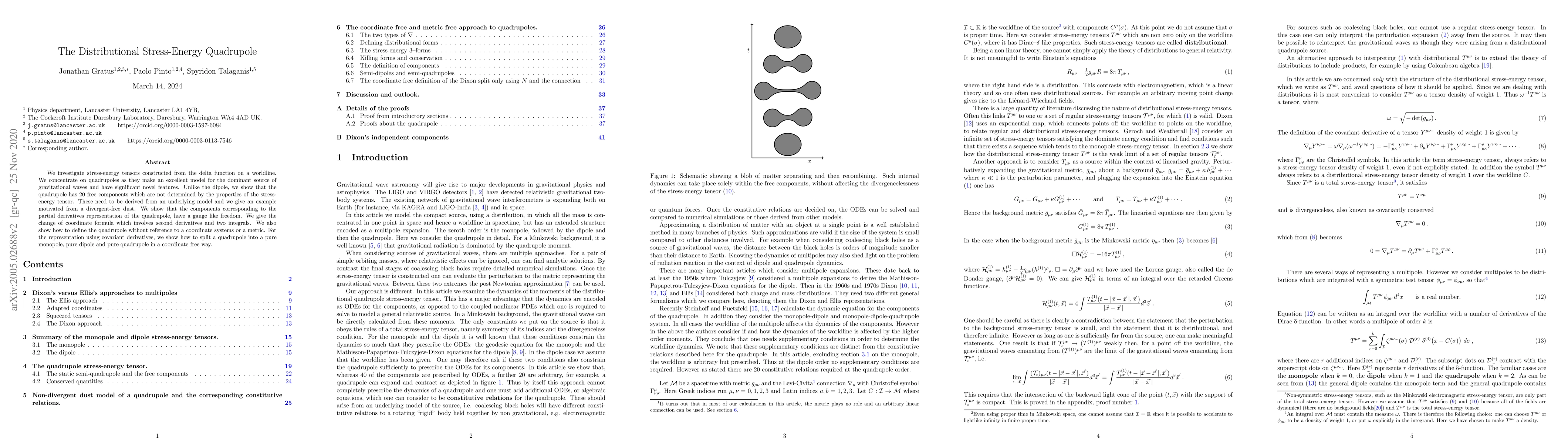 We investigate stress-energy tensors constructed from the delta function on a worldline. We concentrate on quadrupoles as they make an excellent model for the dominant source of gravitational waves and have significant novel features. Unlike the dipole, we show that the quadrupole has 20 free components which are not determined by the properties of the stress-energy tensor. These need to be derived from an underlying model and we give an example motivated from a divergent-free dust. We show that the components corresponding to the partial derivatives representation of the quadrupole, have a gauge like freedom. We give the change of coordinate formula which involves second derivatives and two integrals. We also show how to define the quadrupole without reference to a coordinate systems or a metric. For the representation using covariant derivatives, we show how to split a quadrupole into a pure monopole, pure dipole and pure quadrupole in a coordinate free way.
