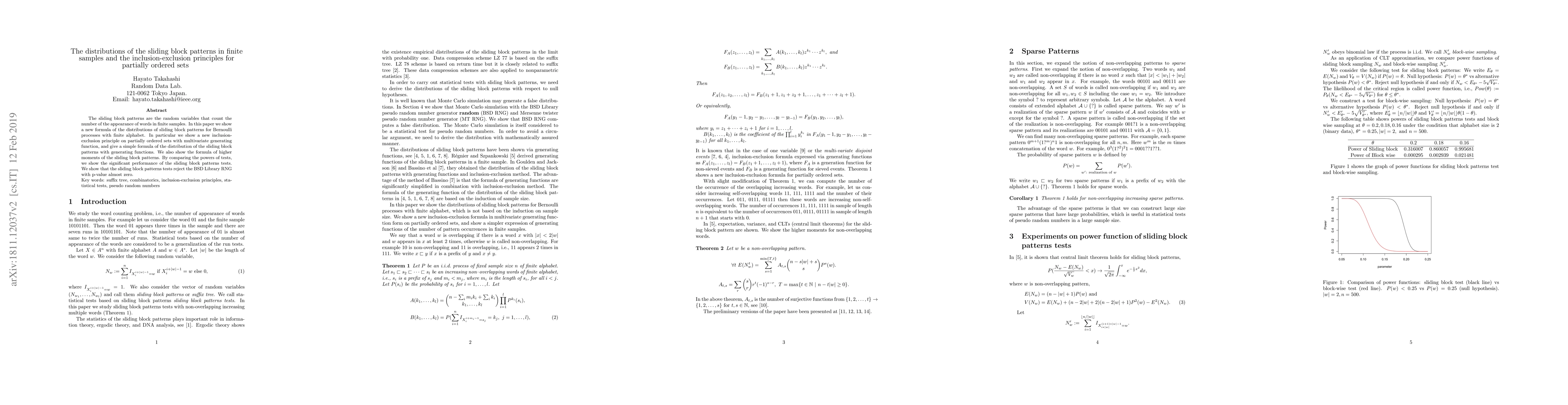 In this paper we show the distributions of sliding block patterns for Bernoulli processes with finite alphabet, which is not based on the induction on sample size. We show a new inclusion-exclusion formula in multivariate generating function form on partially ordered sets, and show a simpler expression of generating functions of the number of pattern occurrences in finite samples. We show higher moments of the sliding block patterns and power of tests based on sliding block patterns.