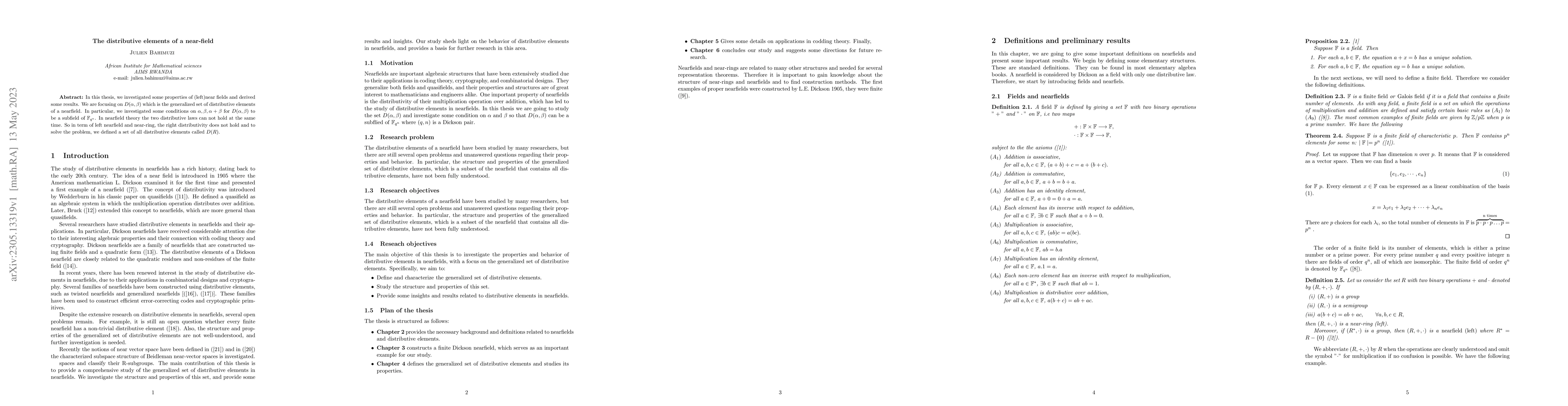 In this thesis, we investigated some properties of (left)near fields and derived some results. We are focusing on $D(\alpha, \beta)$ which is the generalized set of distributive elements of a nearfield. In particular, we investigated some conditions on $\alpha,\beta, \alpha+\beta$ for $D(\alpha, \beta)$ to be a subfield of $\mathbb{F}_{q^{n}}$. In nearfield theory the two distributive laws can not hold at the same time. So in term of left nearfield and near-ring, the right distributivity does not hold and to solve the problem, we defined a set of all distributive elements called $D(R)$.