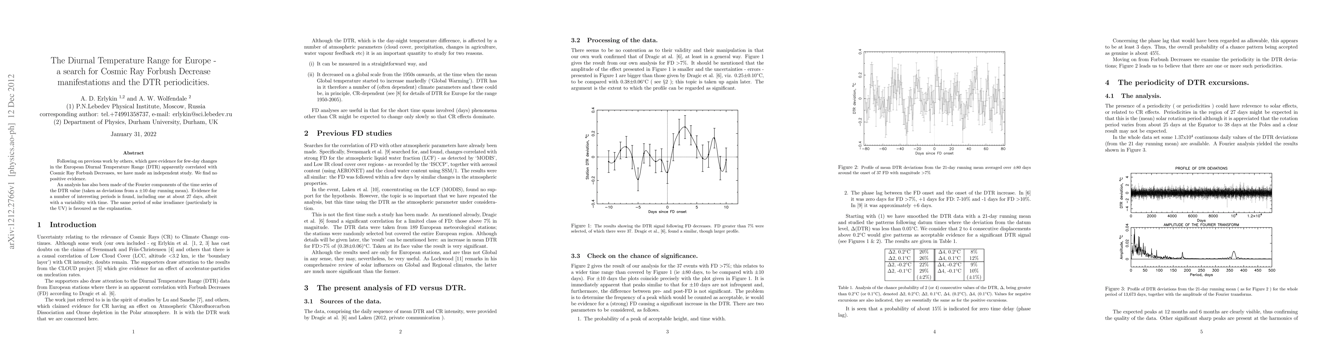 Following on previous work by others, which gave evidence for few-day changes in the European Diurnal Temperature Range (DTR) apparently correlated with Cosmic Ray Forbush Decreases, we have made an independent study. We find no positive evidence. An analysis has also been made of the Fourier components of the time series of the DTR value (taken as deviations from a +/-10 day running mean). Evidence for a number of interesting periods is found, including one at about 27 days, albeit with a variability with time. The same period of solar irradiance (particularly in the UV) is favoured as the explanation.