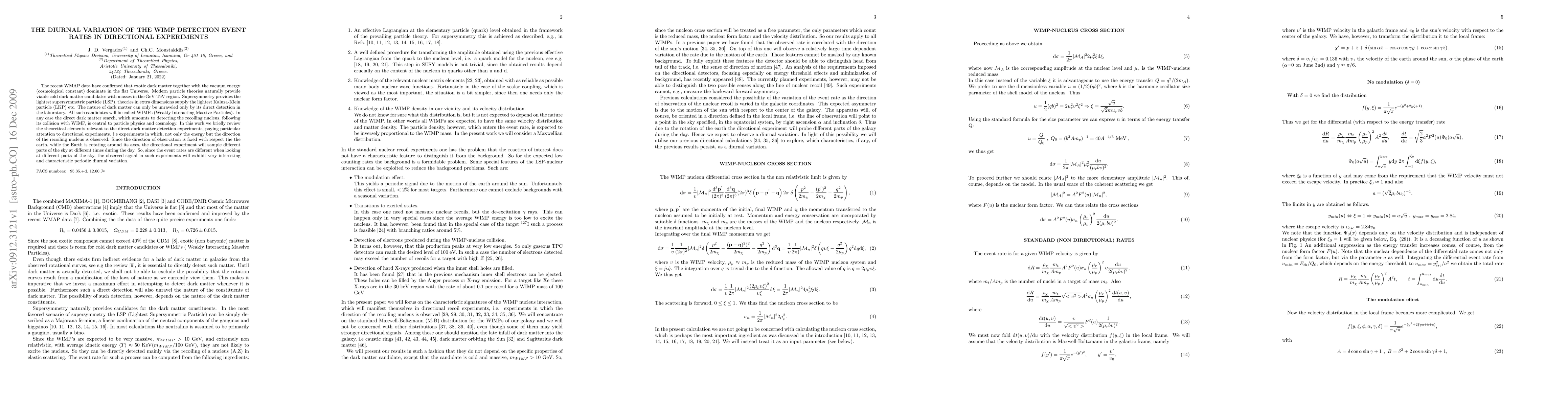 The recent WMAP data have confirmed that exotic dark matter together with the vacuum energy (cosmological constant) dominate in the flat Universe. Modern particle theories naturally provide viable cold dark matter candidates with masses in the GeV-TeV region. Supersymmetry provides the lightest supersymmetric particle (LSP), theories in extra dimensions supply the lightest Kaluza-Klein particle (LKP) etc. The nature of dark matter can only be unraveled only by its direct detection in the laboratory. All such candidates will be called WIMPs (Weakly Interacting Massive Particles). In any case the direct dark matter search, which amounts to detecting the recoiling nucleus, following its collision with WIMP, is central to particle physics and cosmology. In this work we briefly review the theoretical elements relevant to the direct dark matter detection experiments, paying particular attention to directional experiments. i.e experiments in which, not only the energy but the direction of the recoiling nucleus is observed. Since the direction of observation is fixed with respect the the earth, while the Earth is rotating around its axes, the directional experiment will sample different parts of the sky at different times during the day. So, since the event rates are different when looking at different parts of the sky, the observed signal in such experiments will exhibit very interesting and characteristic periodic diurnal variation.