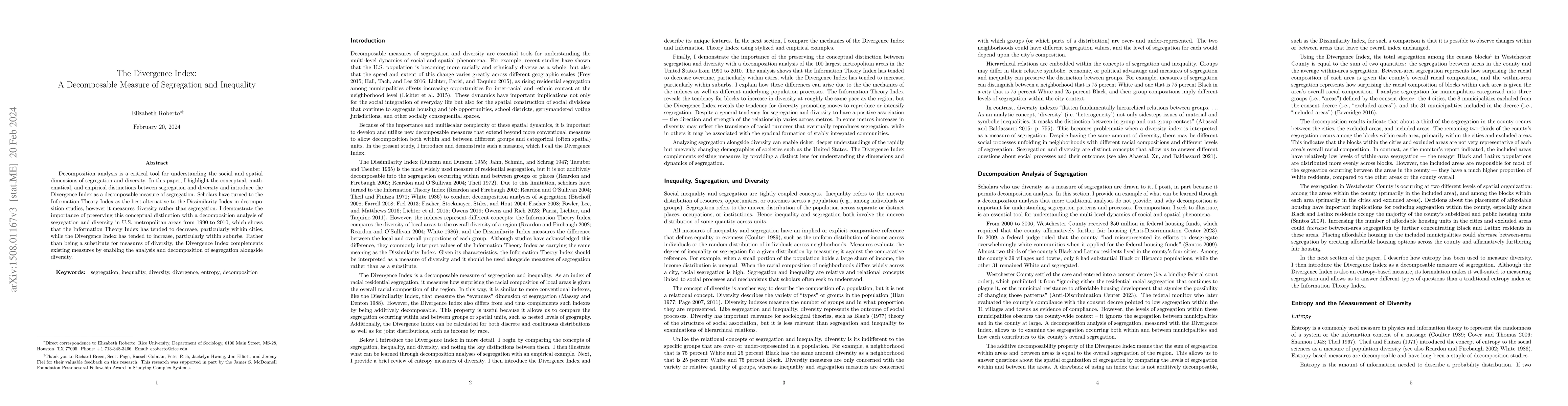 This paper introduces the Divergence Index as a decomposable measure of segregation, contrasting it with the Information Theory Index which measures diversity. It demonstrates the Divergence Index's effectiveness in analyzing segregation trends in U.S. metropolitan areas from 1990 to 2010, showing an increase in segregation, particularly in suburbs.