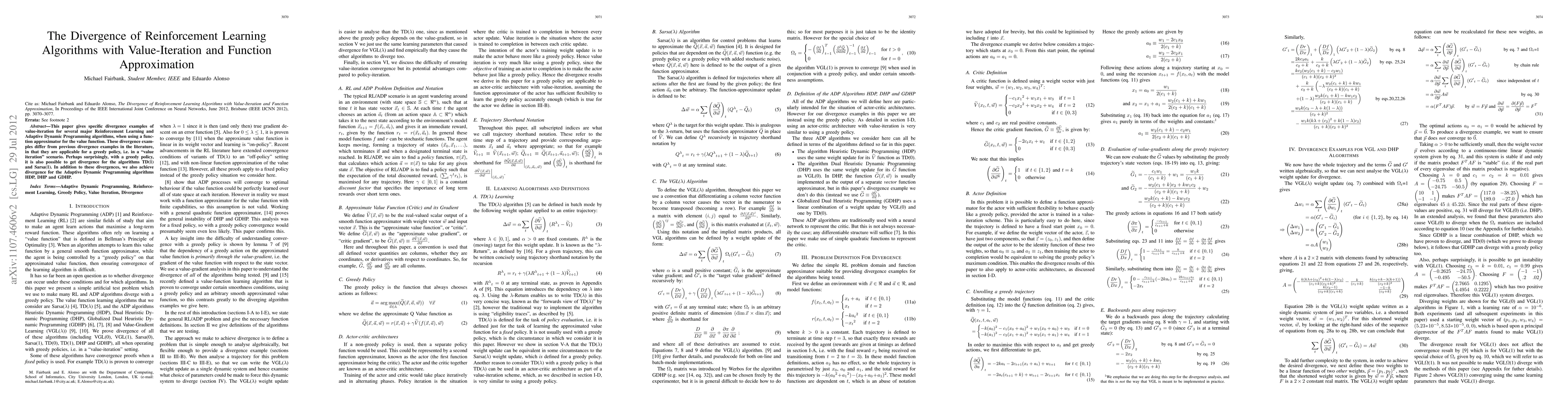 This paper demonstrates specific divergence cases for value-iteration in major Reinforcement Learning algorithms, including TD(1) and Sarsa(1), when employing function approximation. It reveals unexpected divergence even under greedy policies, extending previous divergence examples in the literature.