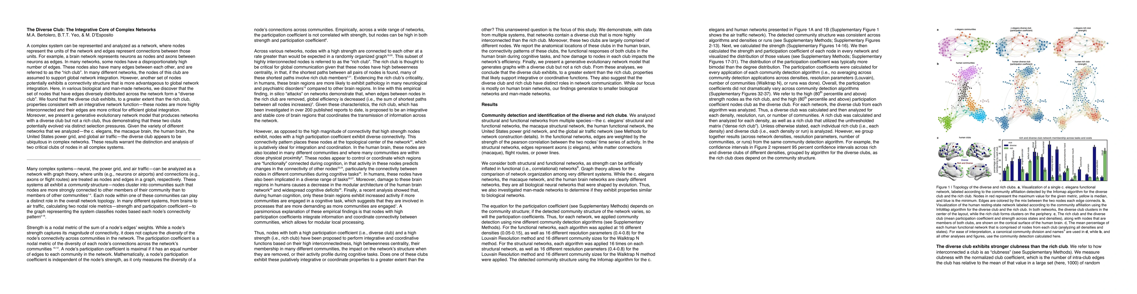 This paper identifies the diverse club in various complex networks, a set of nodes with edges distributed across the network, which is more critical for global integration than the rich club. The study suggests that diverse clubs may have evolved under different selection pressures than the rich club, and their presence is ubiquitous across biological and man-made networks.