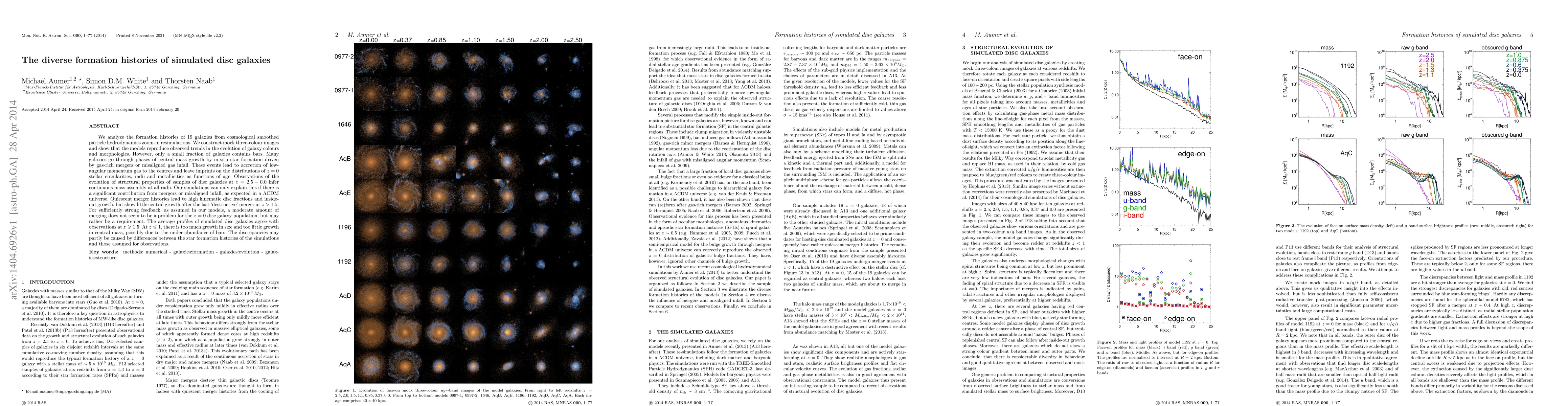 We analyze the formation histories of 19 galaxies from cosmological smoothed particle hydrodynamics zoom-in resimulations. We construct mock three-colour images and show that the models reproduce observed trends in the evolution of galaxy colours and morphologies. However, only a small fraction of galaxies contains bars. Many galaxies go through phases of central mass growth by in-situ star formation driven by gas-rich mergers or misaligned gas infall. These events lead to accretion of low-angular momentum gas to the centres and leave imprints on the distributions of z=0 stellar circularities, radii and metallicities as functions of age. Observations of the evolution of structural properties of samples of disc galaxies at z=2.5-0.0 infer continuous mass assembly at all radii. Our simulations can only explain this if there is a significant contribution from mergers or misaligned infall, as expected in a LambdaCDM universe. Quiescent merger histories lead to high kinematic disc fractions and inside-out growth, but show little central growth after the last `destructive' merger at z>1.5. For sufficiently strong feedback, as assumed in our models, a moderate amount of merging does not seem to be a problem for the z=0 disc galaxy population, but may rather be a requirement. The average profiles of simulated disc galaxies agree with observations at z>=1.5. At z<=1, there is too much growth in size and too little growth in central mass, possibly due to the under-abundance of bars. The discrepancies may partly be caused by differences between the star formation histories of the simulations and those assumed for observations.