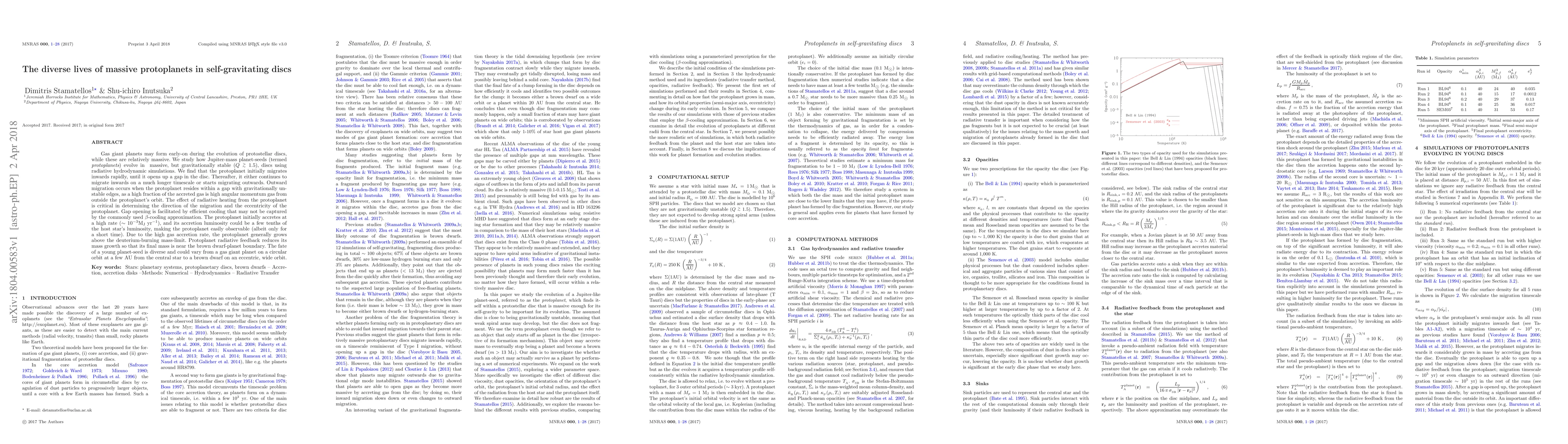 Gas giant planets may form early-on during the evolution of protostellar discs, while these are relatively massive. We study how Jupiter-mass planet-seeds (termed protoplanets) evolve in massive, but gravitationally stable (Q>1.5), discs using radiative hydrodynamic simulations. We find that the protoplanet initially migrates inwards rapidly, until it opens up a gap in the disc. Thereafter, it either continues to migrate inwards on a much longer timescale or starts migrating outwards. Outward migration occurs when the protoplanet resides within a gap with gravitationally unstable edges, as a high fraction of the accreted gas is high angular momentum gas from outside the protoplanet's orbit. The effect of radiative heating from the protoplanet is critical in determining the direction of the migration and the eccentricity of the protoplanet. Gap opening is facilitated by efficient cooling that may not be captured by the commonly used beta-cooling approximation. The protoplanet initially accretes at a high rate (1e-3Mj/yr), and its accretion luminosity could be a few tenths of the host star's luminosity, making the protoplanet easily observable (albeit only for a short time). Due to the high gas accretion rate, the protoplanet generally grows above the deuterium-burning mass-limit. Protoplanet radiative feedback reduces its mass growth so that its final mass is near the brown dwarf-planet boundary. The fate of a young planet-seed is diverse and could vary from a gas giant planet on a circular orbit at a few AU from the central star to a brown dwarf on an eccentric, wide orbit.