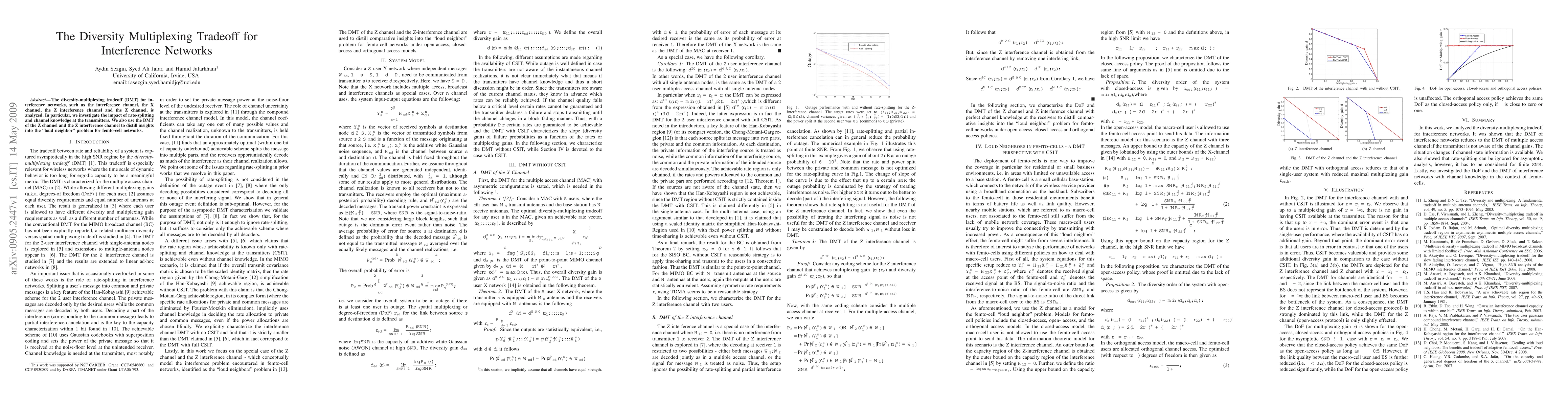 This paper analyzes the diversity-multiplexing tradeoff for interference networks, focusing on rate-splitting strategies and transmitter channel knowledge. It also uses insights from the Z channel and Z interference channel to address the "loud neighbor" problem in femto-cell networks.