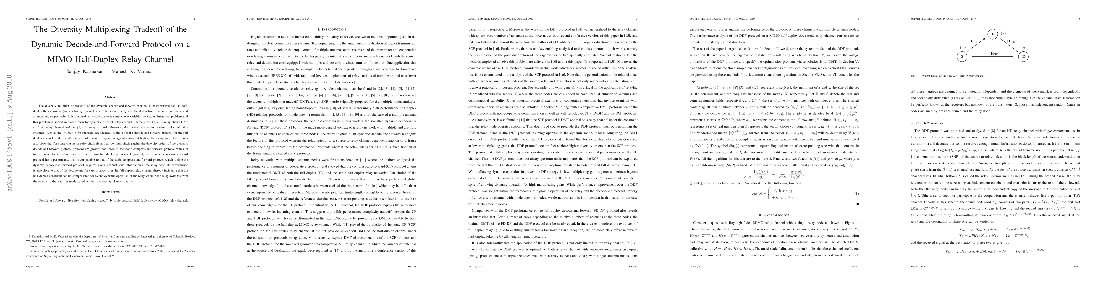 The diversity-multiplexing tradeoff of the dynamic decode-and-forward protocol is characterized for the half-duplex three-terminal (m,k,n)-relay channel where the source, relay and the destination terminals have m, k and n antennas, respectively. It is obtained as a solution to a simple, two-variable, convex optimization problem and this problem is solved in closed form for special classes of relay channels, namely, the (1,k,1) relay channel, the (n,1,n) relay channel and the (2,k,2) relay channel. Moreover, the tradeoff curves for a certain class of relay channels, such as the (m,k,n>k) channels, are identical to those for the decode-and-forward protocol for the full duplex channel while for other classes of channels they are marginally lower at high multiplexing gains. Our results also show that for some classes of relay channels and at low multiplexing gains the diversity orders of the dynamic decode-and-forward protocol protocol are greater than those of the static compress-and-forward protocol which in turn is known to be tradeoff optimal over all {\em static} half duplex protocols. In general, the dynamic decode-and-forward protocol has a performance that is comparable to that of the static compress-and-forward protocol which, unlike the dynamic decode-and-forward protocol, requires global channel state information at the relay node. Its performance is also close to that of the decode-and-forward protocol over the full-duplex relay channel thereby indicating that the half-duplex constraint can be compensated for by the dynamic operation of the relay wherein the relay switches from the receive to the transmit mode based on the source-relay channel quality.